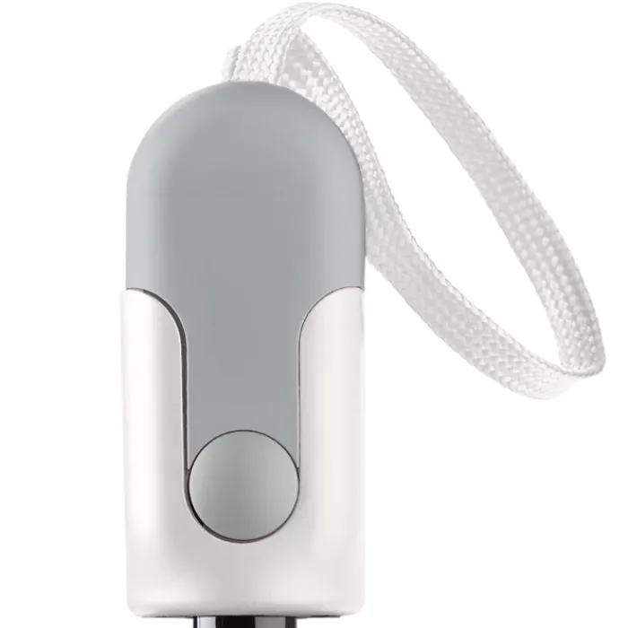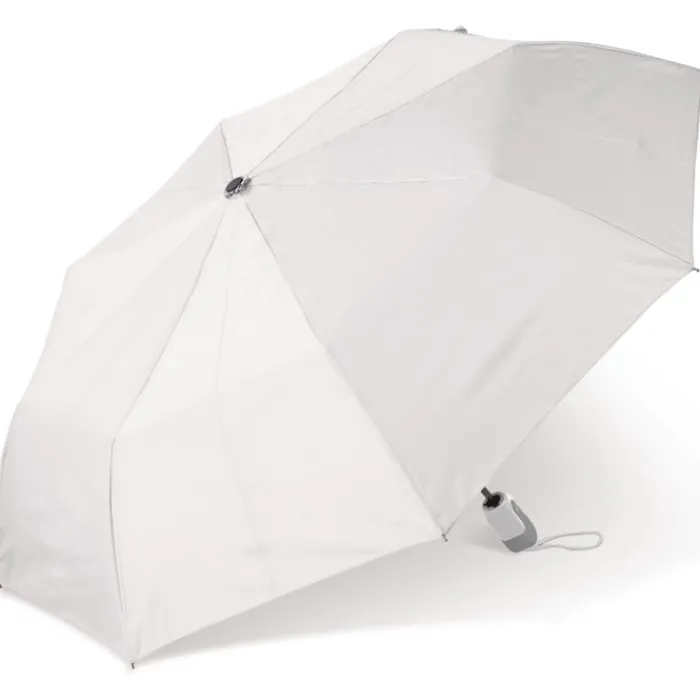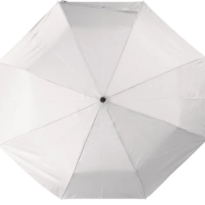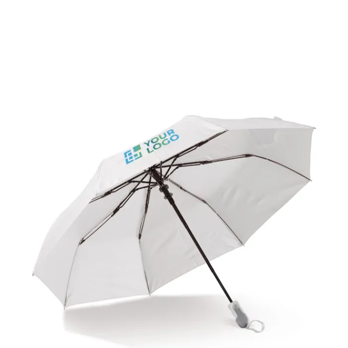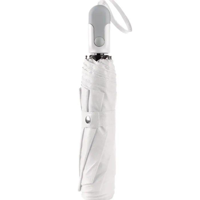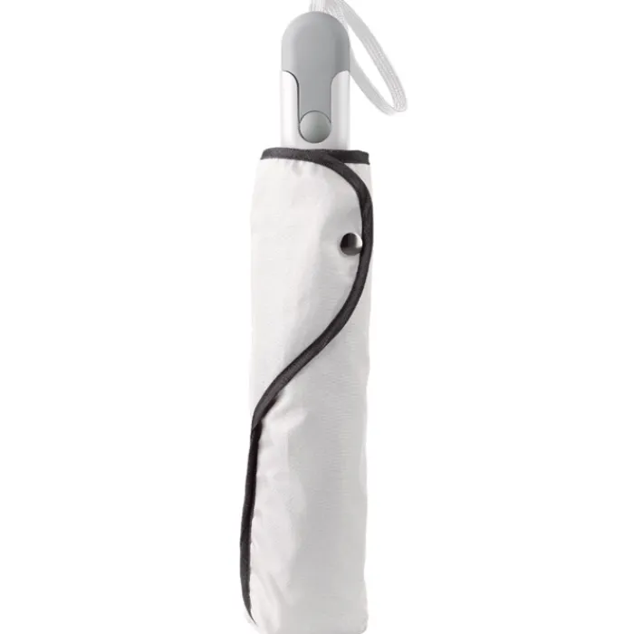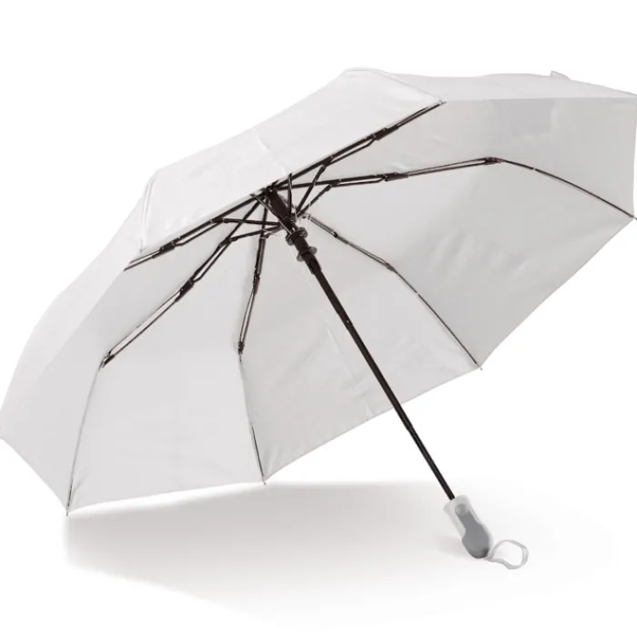 Bellissimo ombrello pieghevole con impugnatura ergonomica. Le coste del telaio sono realizzate in fibra di vetro per una maggiore durata. Il telaio nero dona un piacevole contrasto con il bianco della tela realizzata in poliestere pongee 170T.