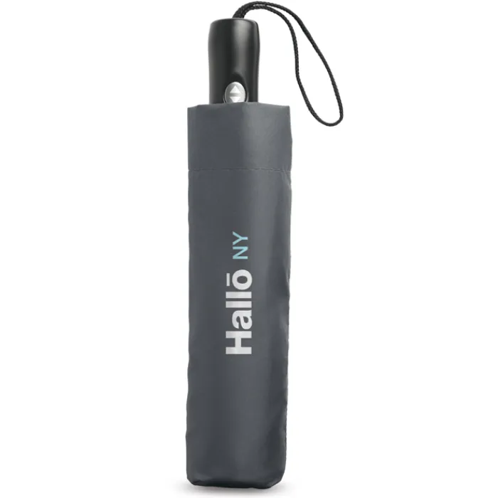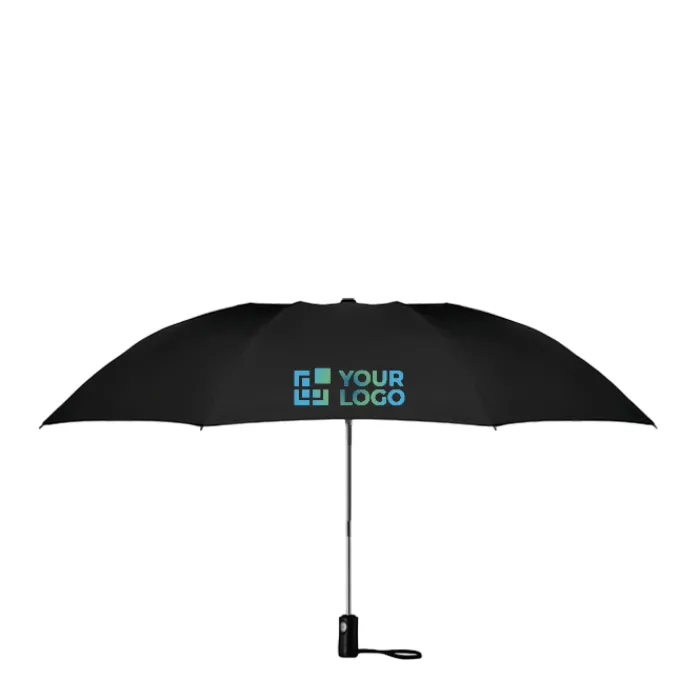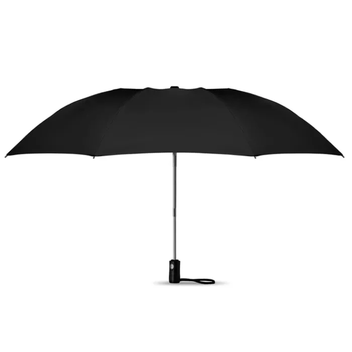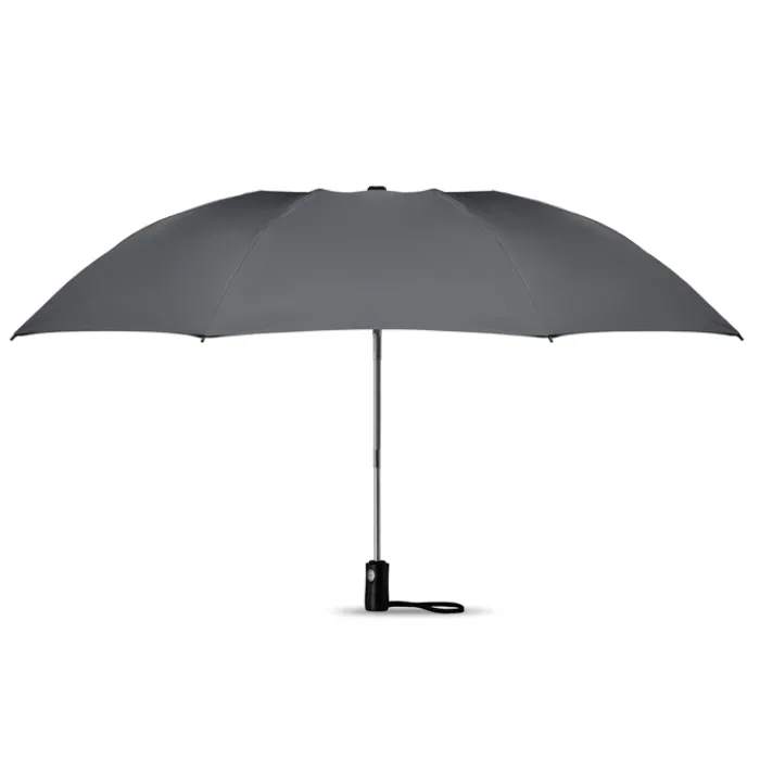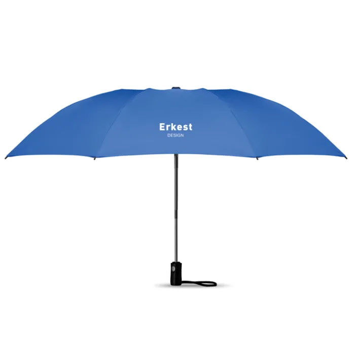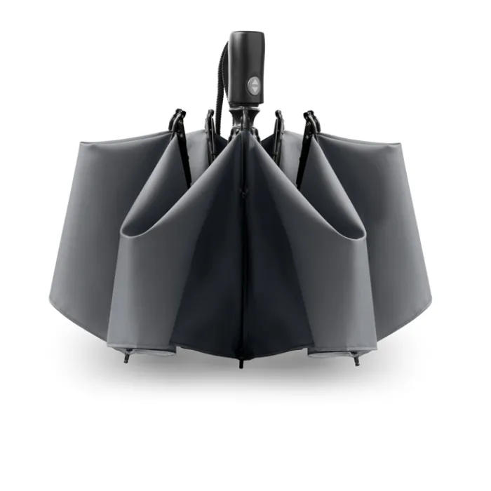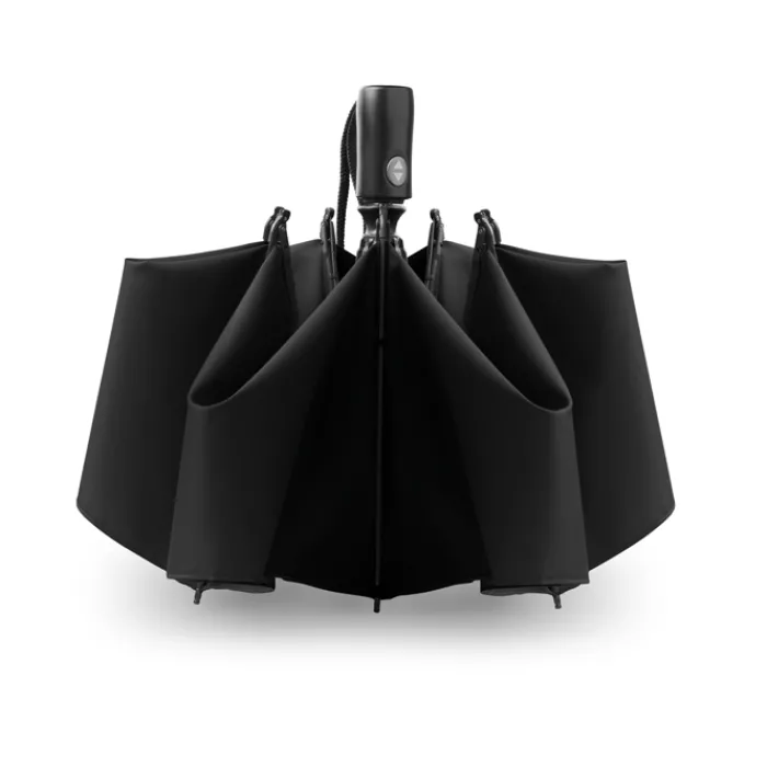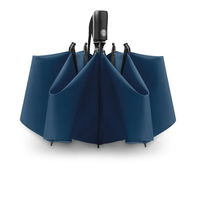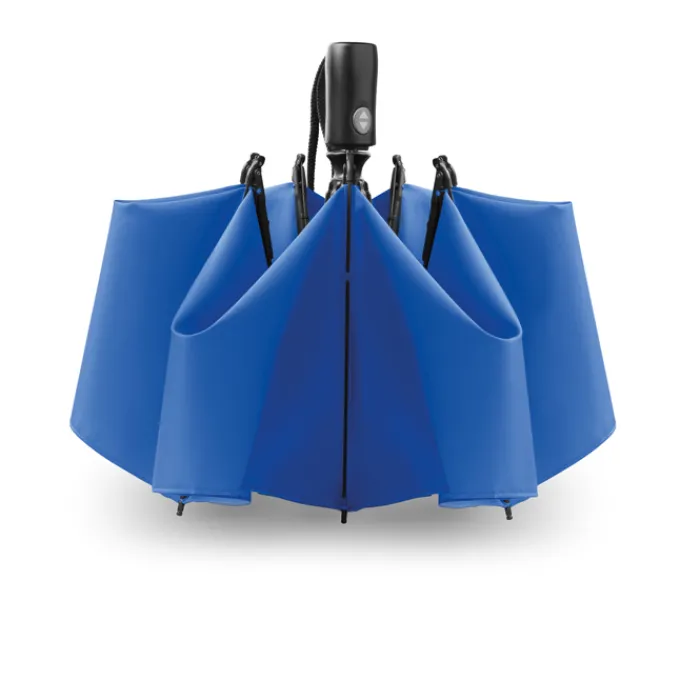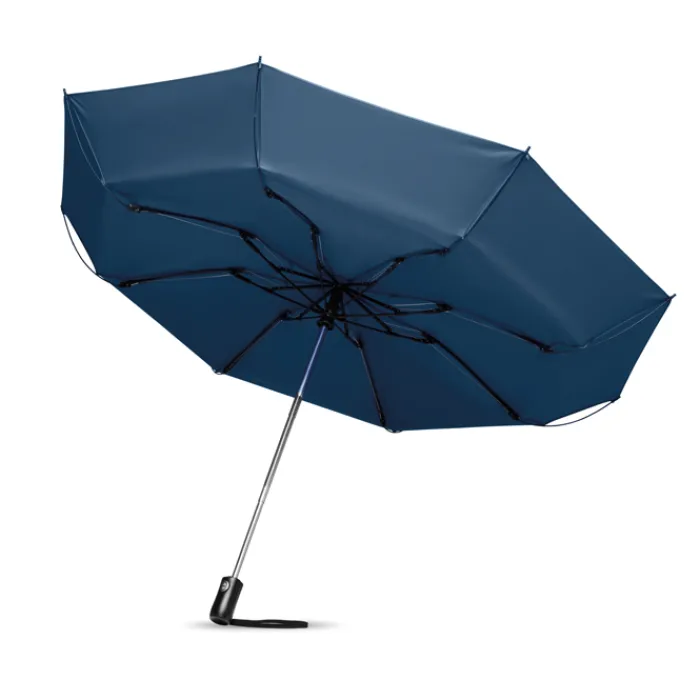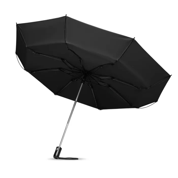 “Ombrello reversibile 23″” in pongee e asta in metallo cromato. Struttura in fibra di vetro. Manico in ABS con pulsante. In pouch abbinata. ”