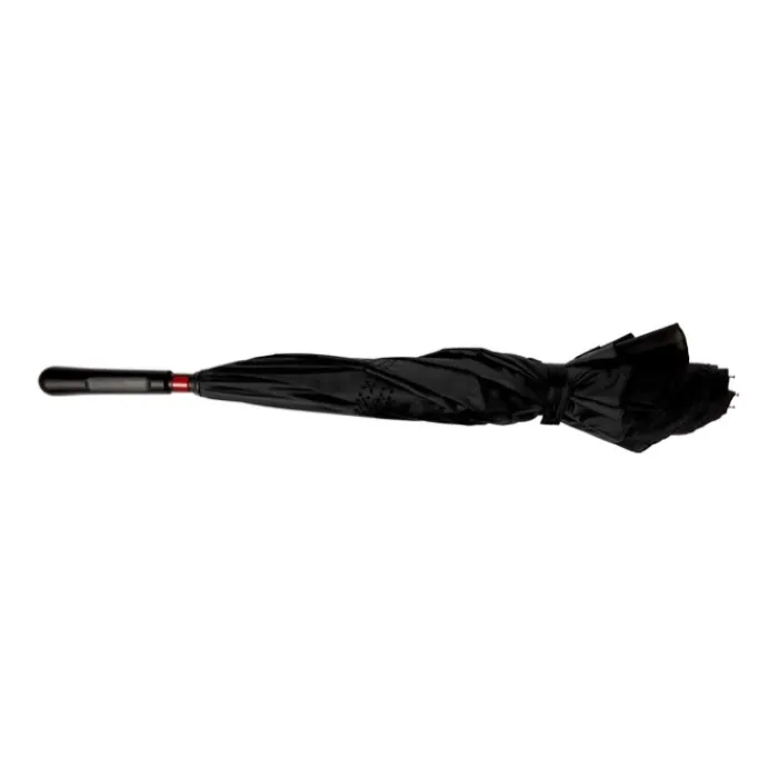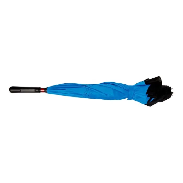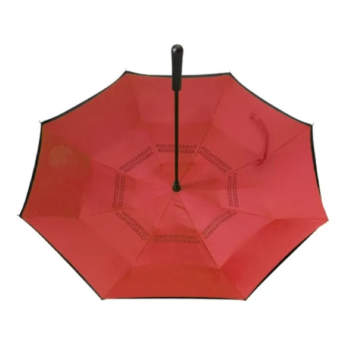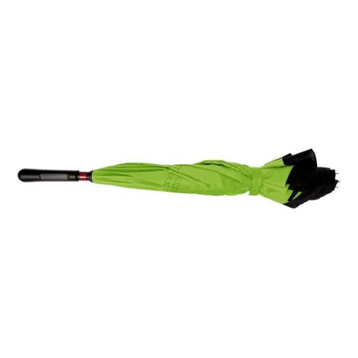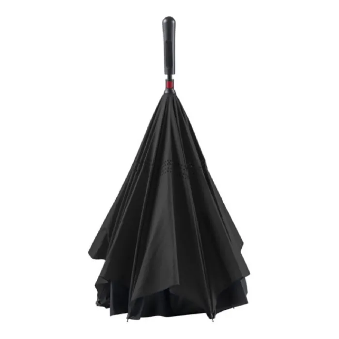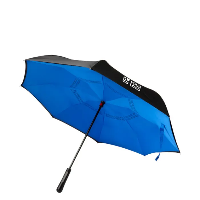 Ombrello reversibile a due strati con 8 pannelli in pongee di seta naturale. Struttura in fibra di vetro nera, aste e maniglia in plastica. Chiusura in velcro.