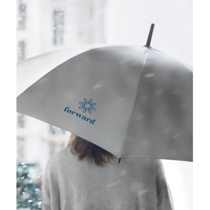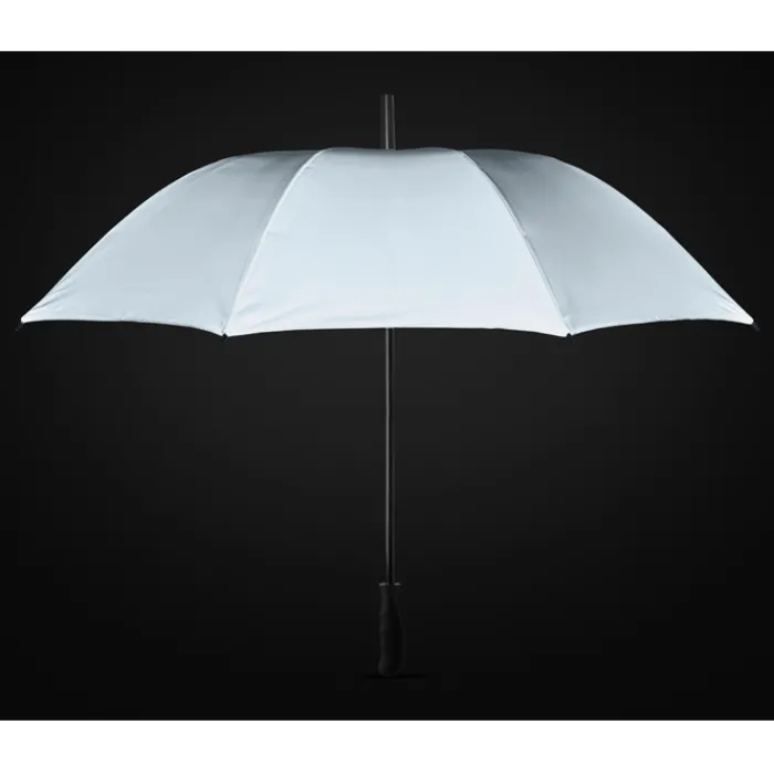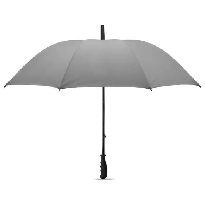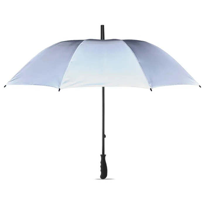 Ombrello da 23” ad apertura manuale in poliestere altamente riflettente con asta e stecche in fibra di vetro. Parte superiore e punte in plastica nera. Manico in gomma nera. Certificato EN13356