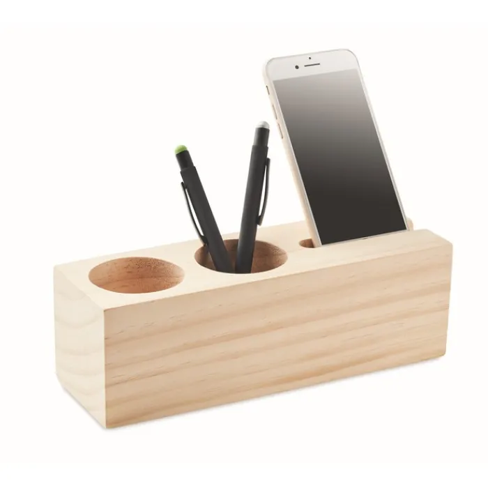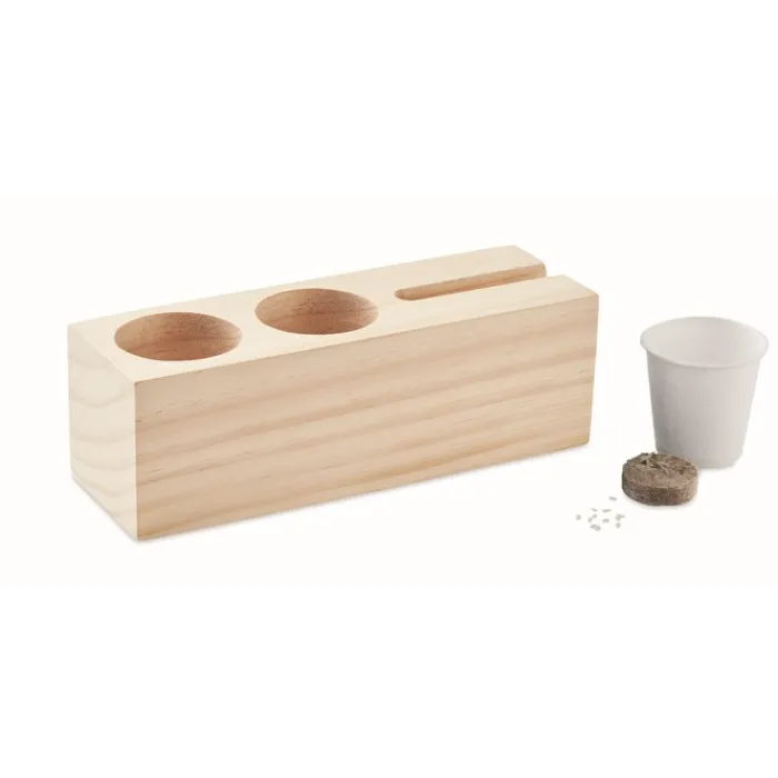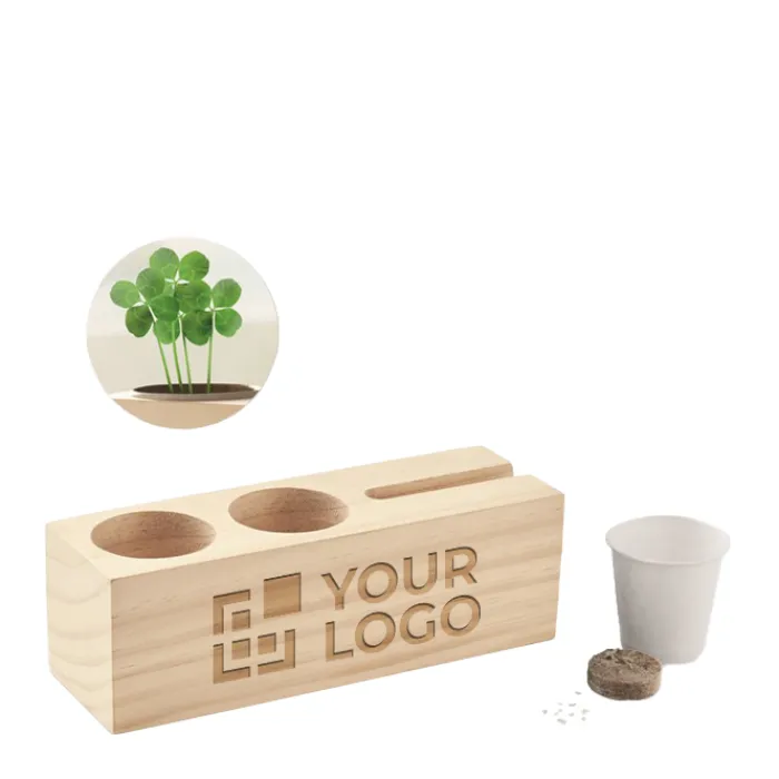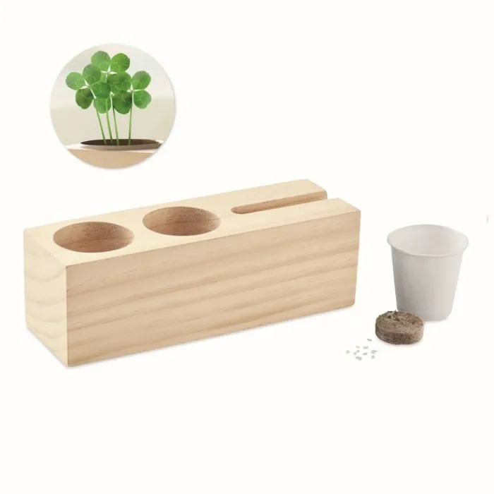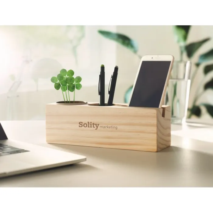 Accessorio da scrivania in legno con 3 spazi: uno per appoggiare il cellulare, uno per penne e matite, ed infine uno per poter piantare dei semi di trifoglio che sono inclusi.