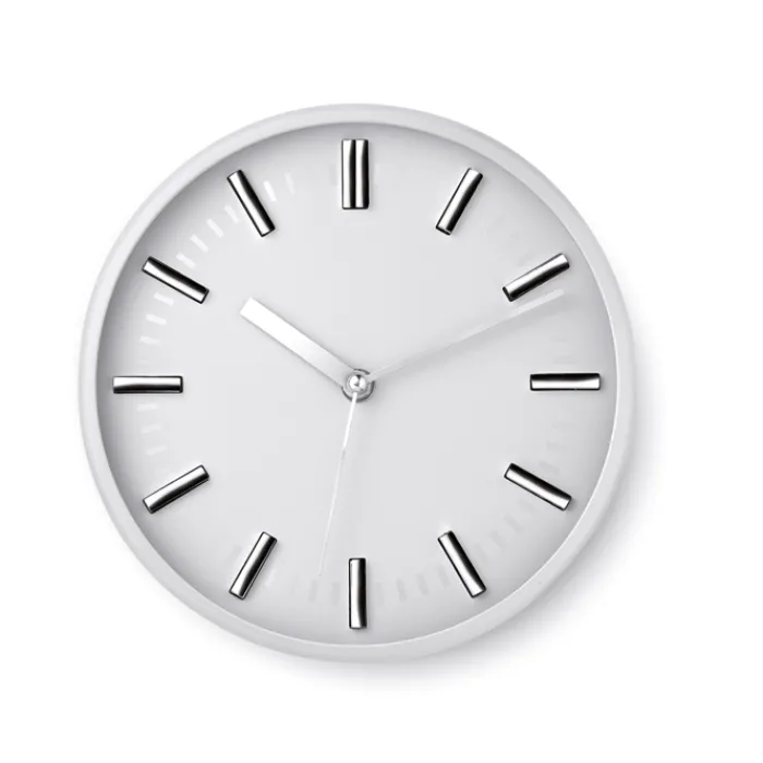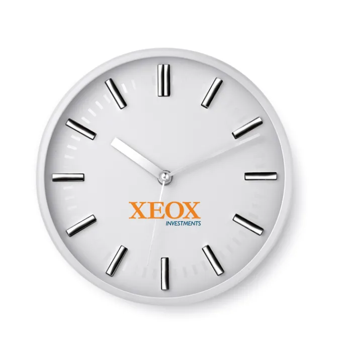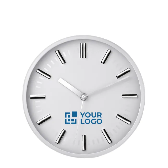 Orologio analogico da parete con sistema ‘clic clac’ per facilitare la rimozione del quadrante ed eseguire la stampa. In PS e vetro. 1 batteria AA non inclusa.