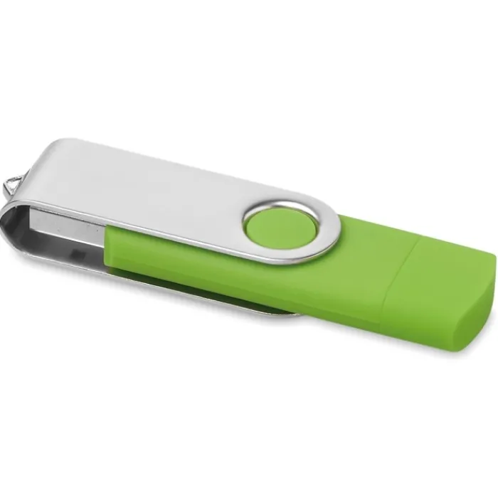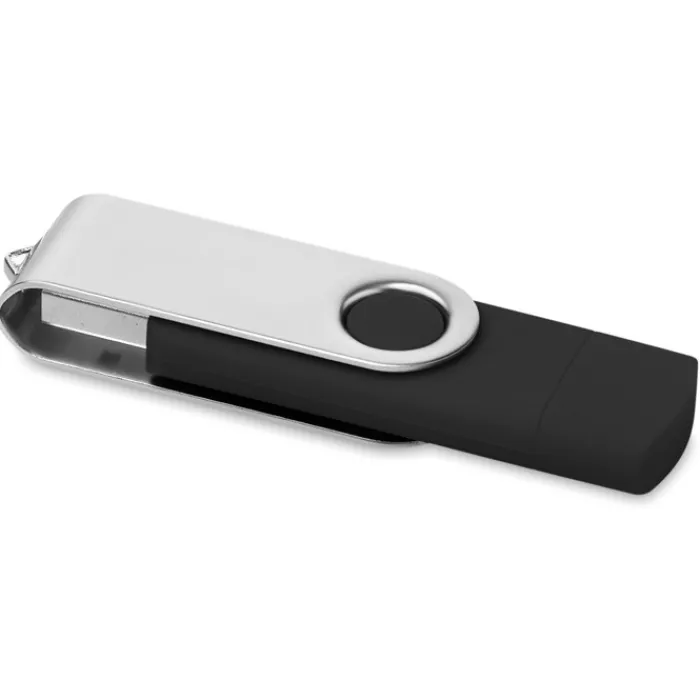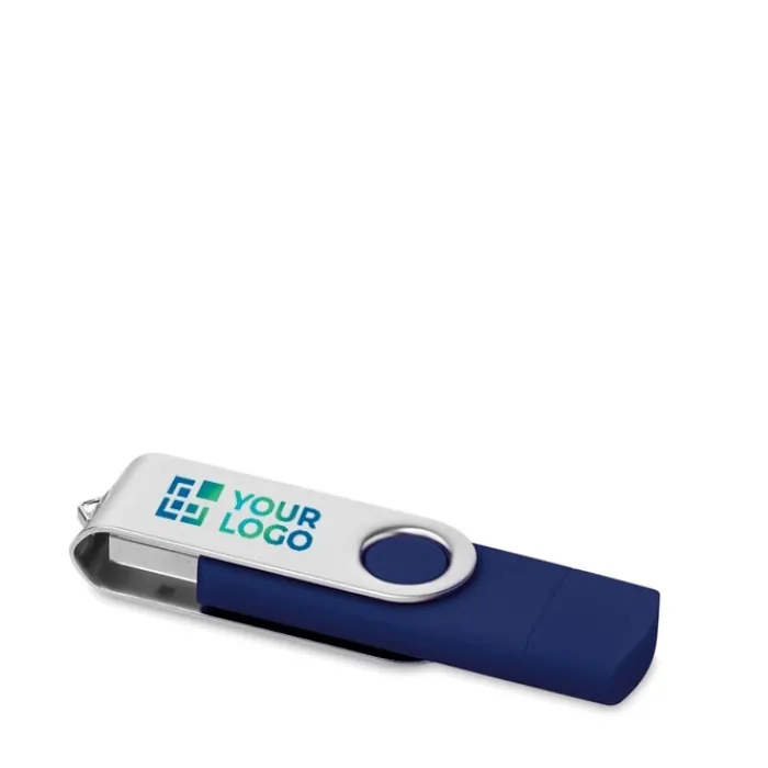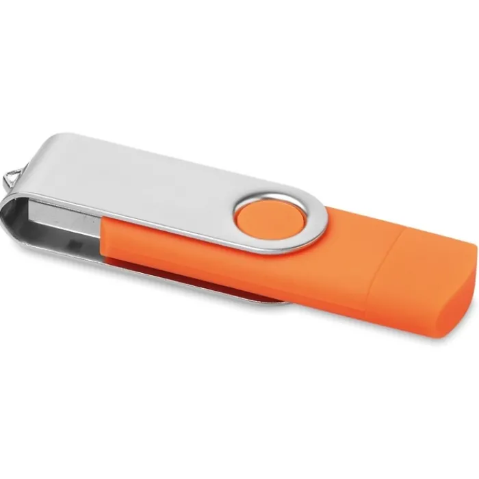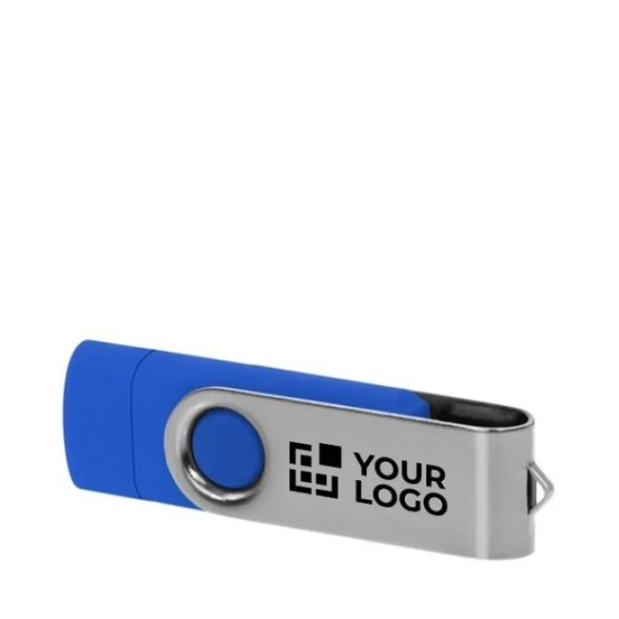 Pendrive OTG con clip in metallo che può ruotare di 360 gradi e doppia porta: da un lato vi é il tradizionale connettore USB e dall’altro vi é un connettore di tipo C.