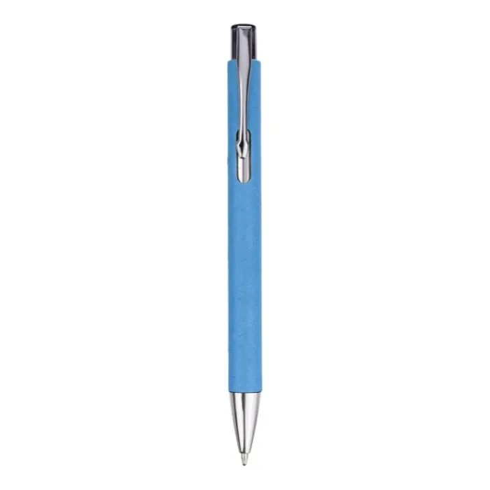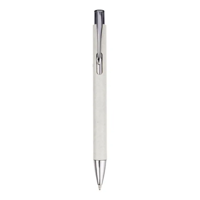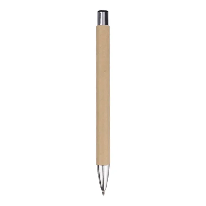 Penna a sfera in cartone riciclato con dettagli cromati. Punta e pulsante in plastica, clip in metallo. Circa 800 metri di scrittura. Inchiostro nero.