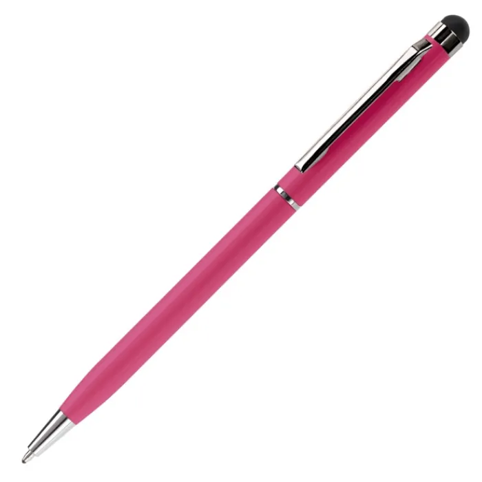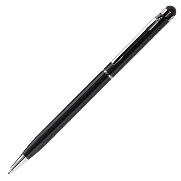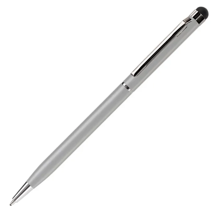 Moderna penna a sfera in alluminio con meccanismo a rotazione. Sulla testa ha un gommino nero touch screen. Inchiostro blu.