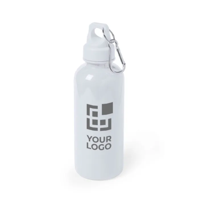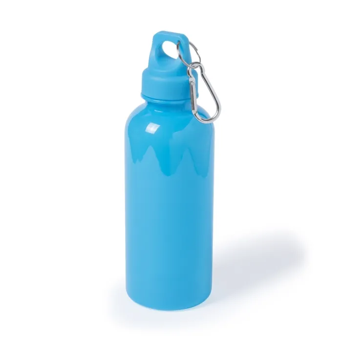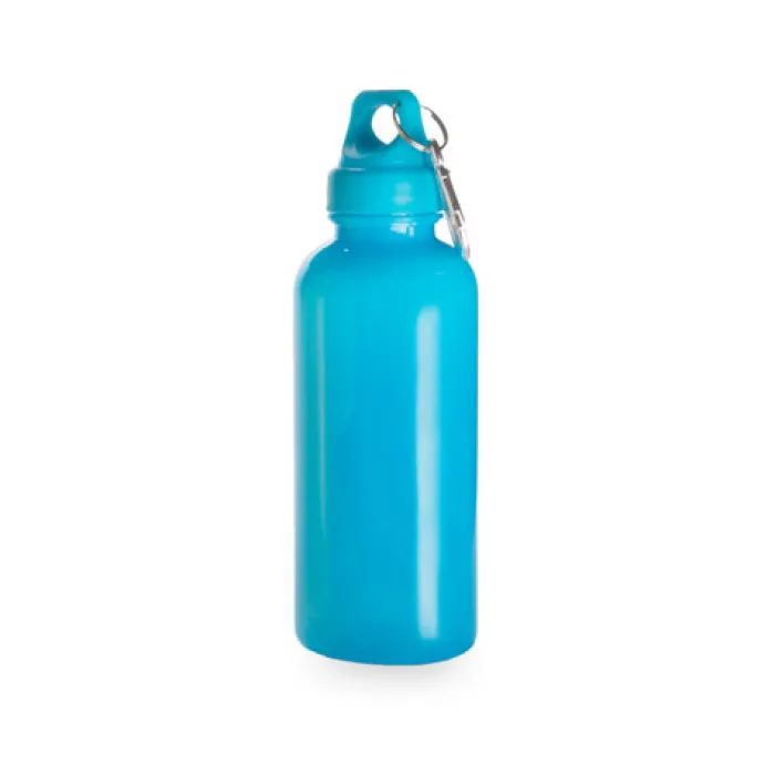 Borraccia da 600 ml con corpo in PS traslucido di vari colori, con tappo di sicurezza a vite e moschettone in metallo.