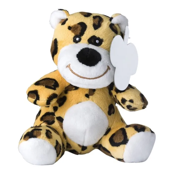 Leopardo di peluche con occhi ricamati. Consegnato con una etichetta personalizzabile.