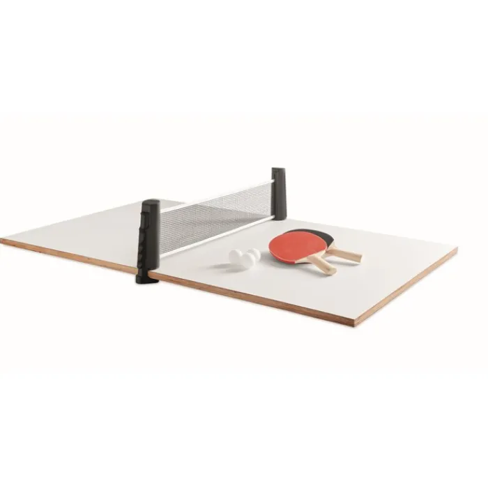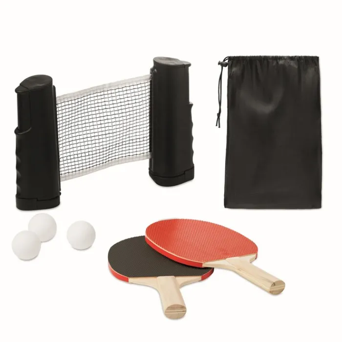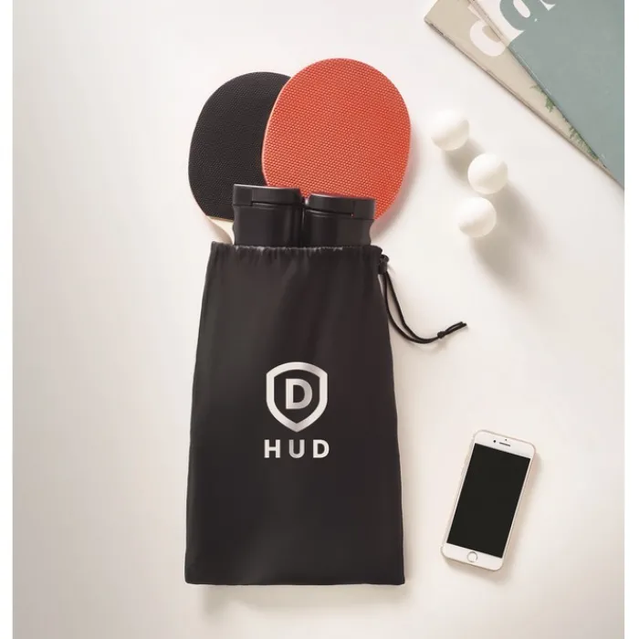 Set da ping pong con rete arrotolabile. Include 3 palline, 2 racchette ed 1 rete estensibile contenuti all’interno di un sacchetto di RPET.