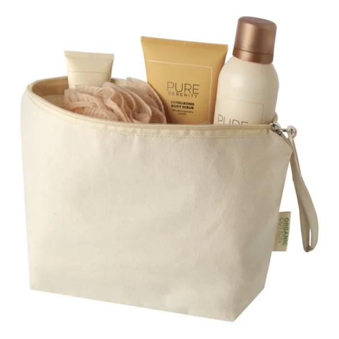 Pochette realizzata in cotone biologico indiano certificato GOTS e Oeko-Tex da 180 g/m². Dotata di un ampio scomparto con cerniera e di un laccetto per portarla facilmente con sé. Capacità: 3 litro.