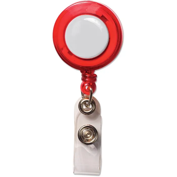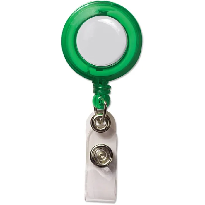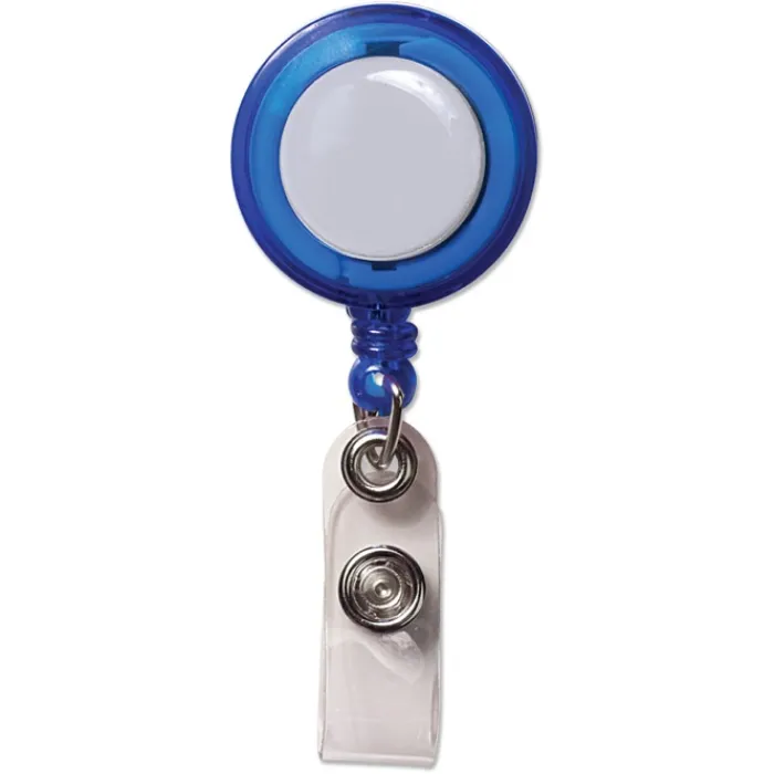 Porta-badge con cinturino riavvolgibile lungo 50 cm. Disponibile in colori trasparenti.