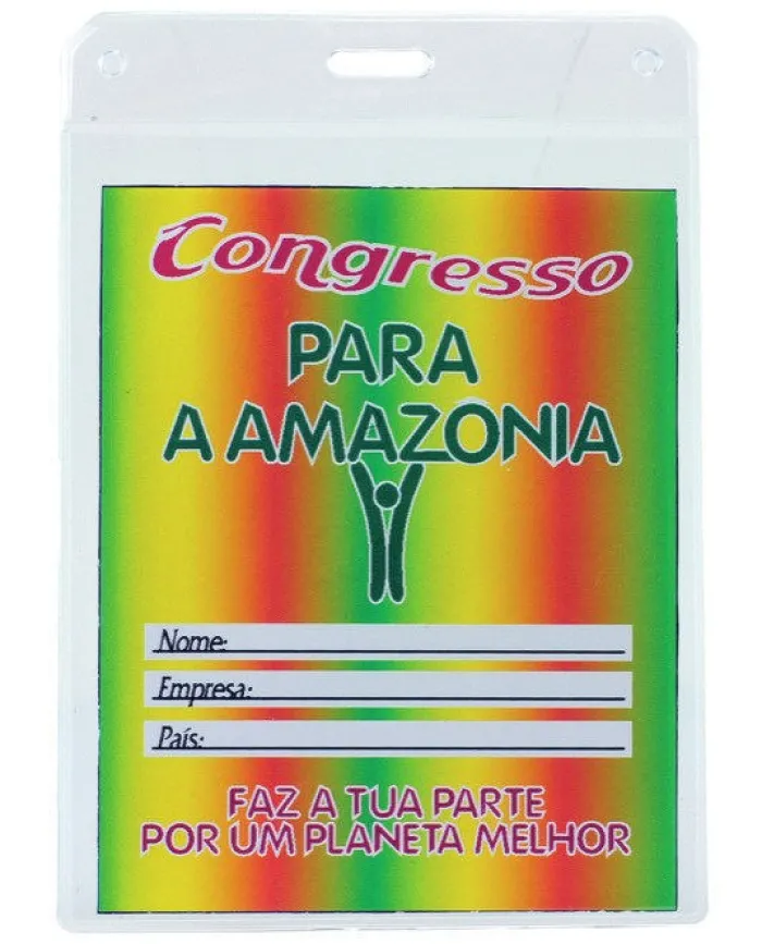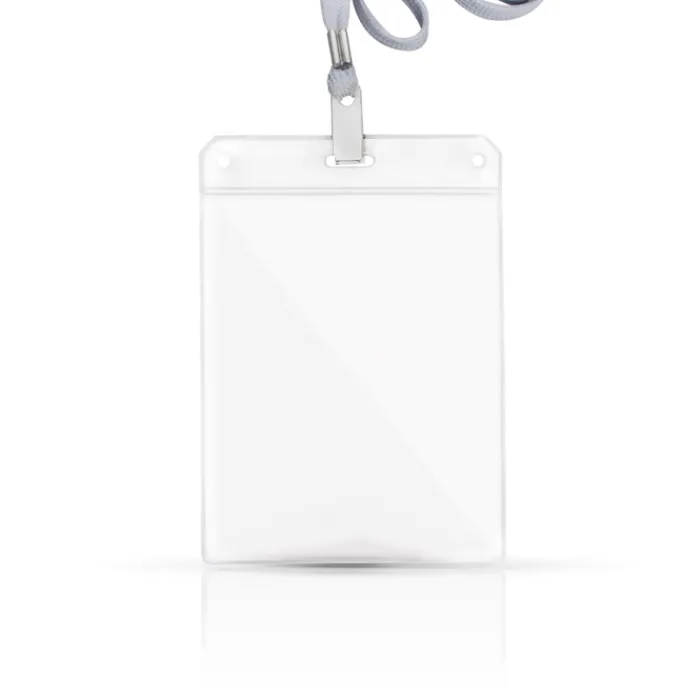 Porta badge di plastica trasparente con laccetto di poliestere per il collo.