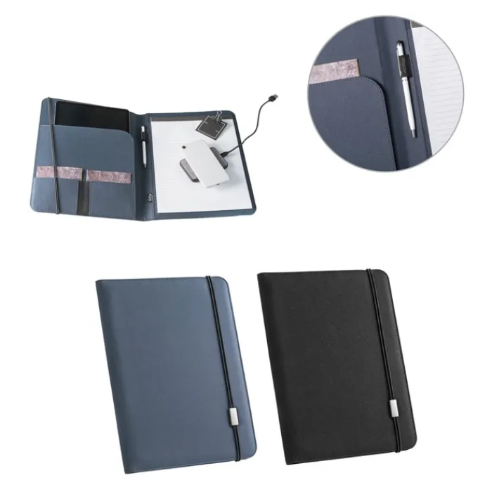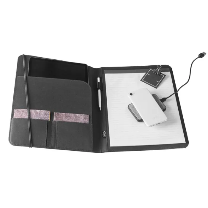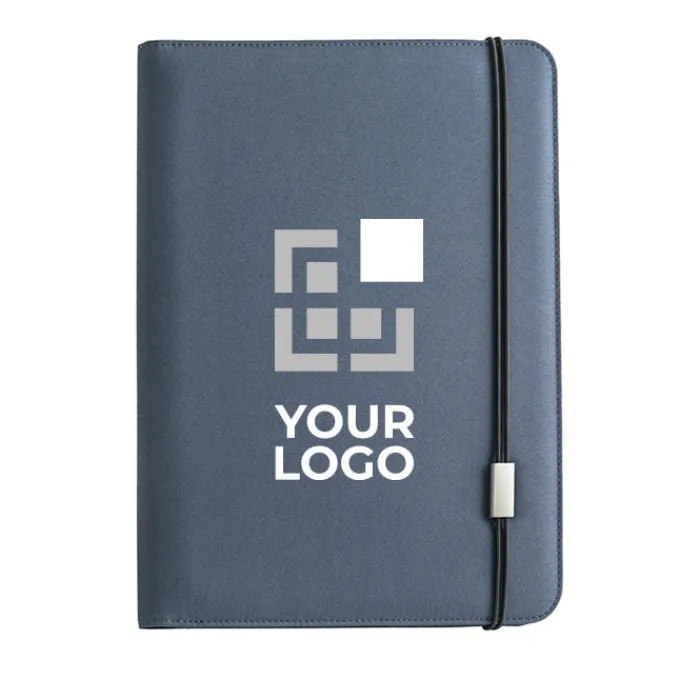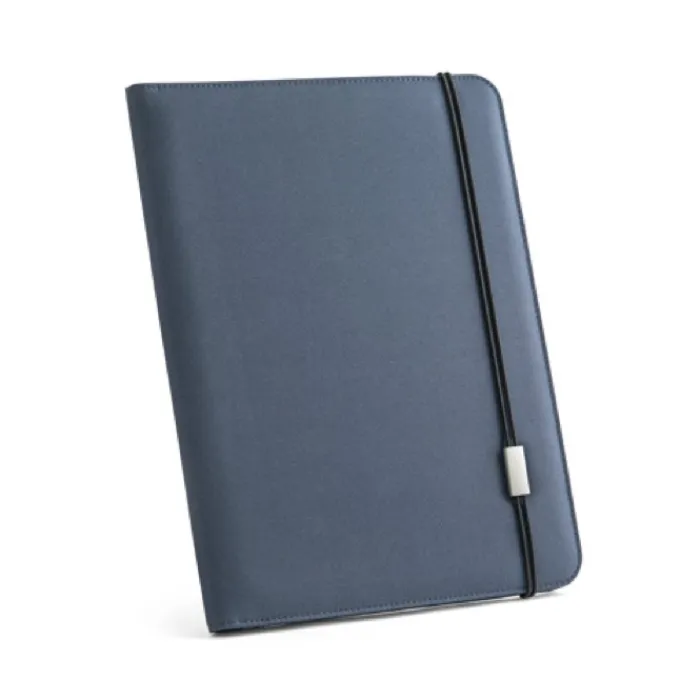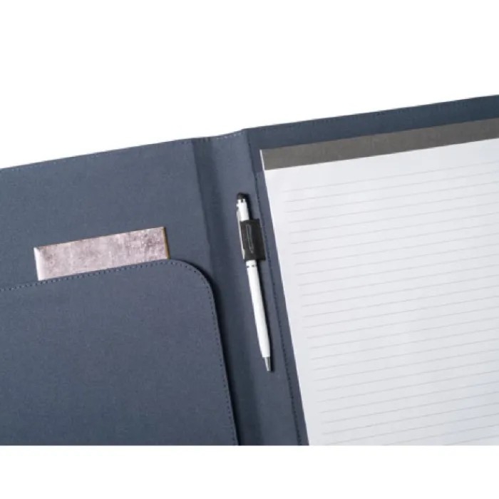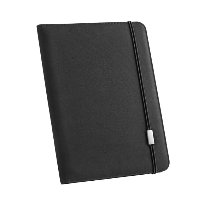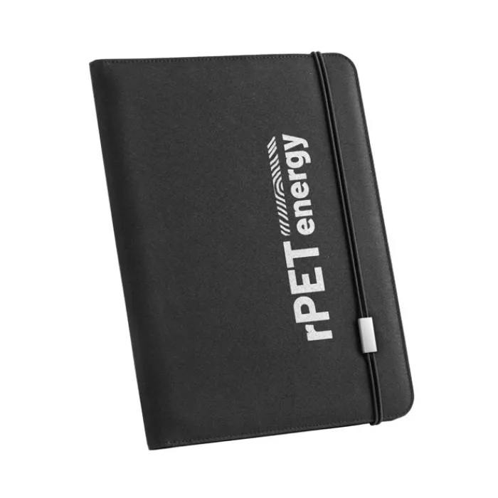 Cartella formato A4 in rPET 300D con chiusura ad elastico. Interno in rPET 210D con diverse tasche, anello porta penna e block notes con 20 fogli a righe bianche su carta certificata FSC. Fornito in un sacchetto di tessuto non tessuto.