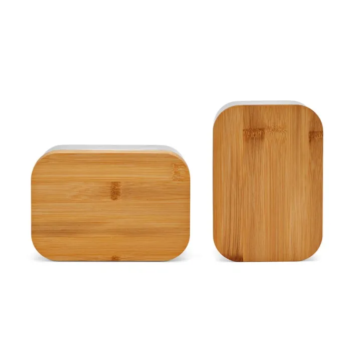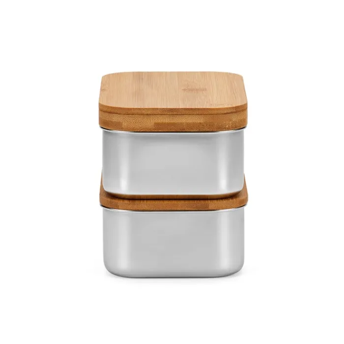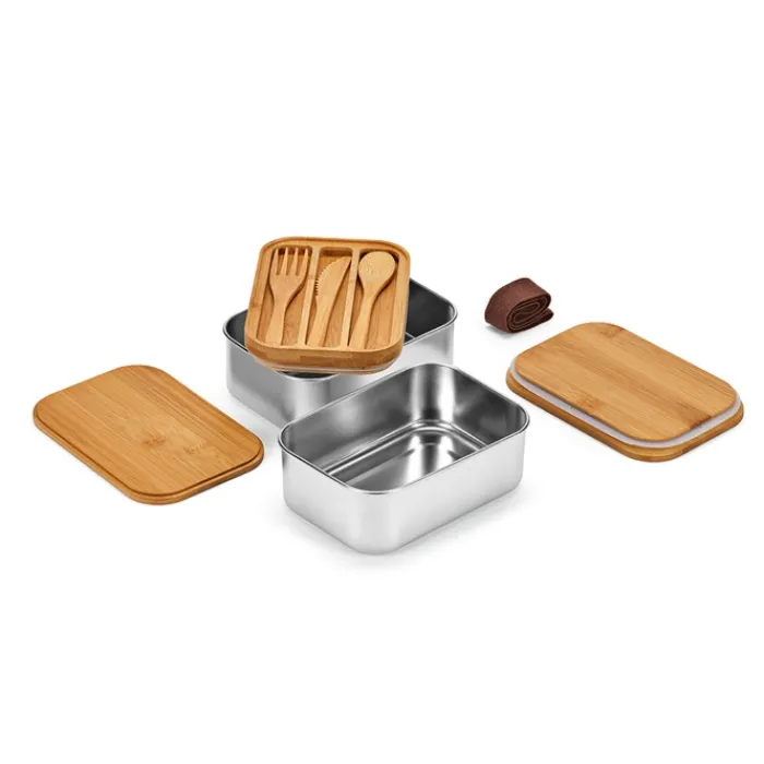 Lunch box doppio dalla capacità totale di 1.480 ml (980 ml utili). Realizzato in acciaio inossidabile riciclato, con doppio coperchio in bambù. Uno dei due contiene al suo interno 3 posate anch’esse in bambù: forchetta, coltello e cucchiaio. Una fascia elastica fissa il coperchio e le due parti insieme per un facile trasporto.
