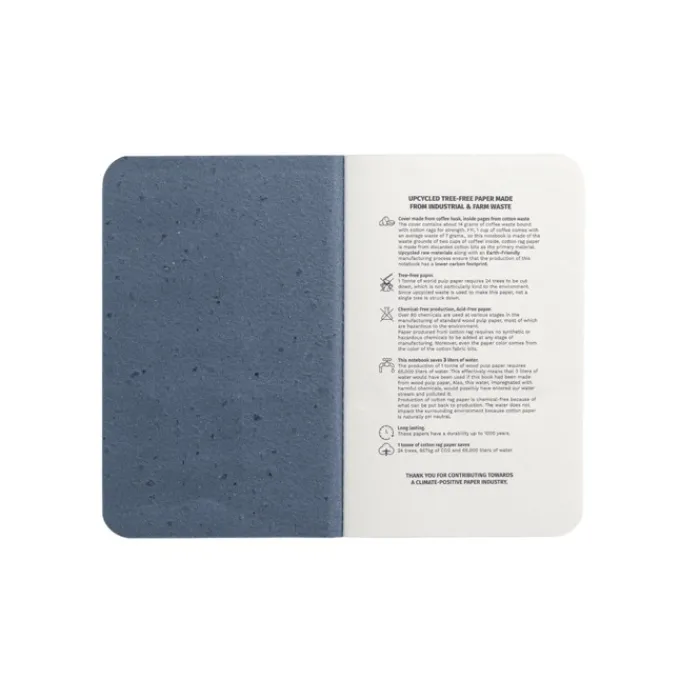 Quaderno formato A6 con copertina flessibile realizzata con gli scarti delle bucce di caffè. Contiene 52 resistenti pagine neutre realizzate con gli scarti del cotone. Consegnato con una fascia di carta con l’immagine di caffè.