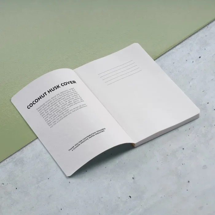 Taccuino formato A5 con copertina morbida realizzata al con 60% con pula di cocco e al 40% con tela di cotone. Contiene 196 pagine a punti riciclate da 80 g/m². All’interno della copertina c’è spiegata la storia del materiale in inglese.