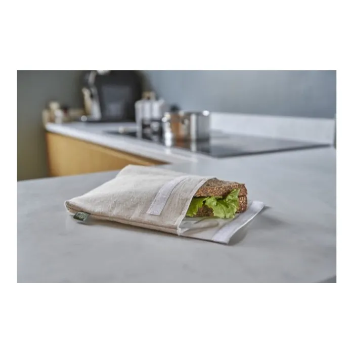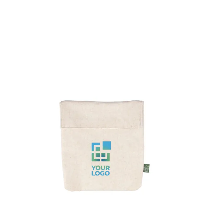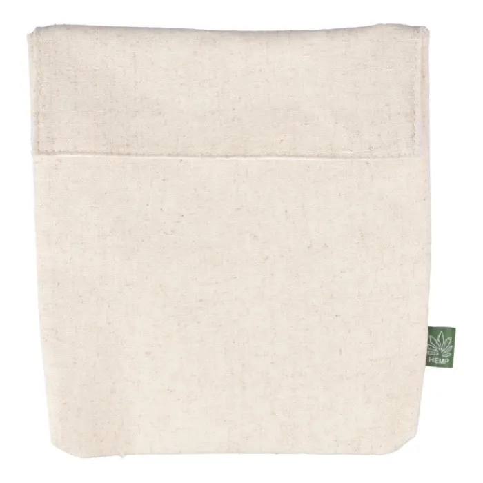 Sacchetto termico in canapa da 170 g/m², con fodera in PEVA e chiusura in velcro. Presenta una piccola etichetta laterale con il logo della canapa.