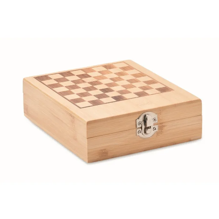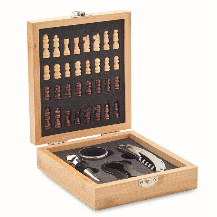 Set da vino in scatola di bambù con scacchiera disegnata sulla parte superiore. All’interno comprende un cavatappi, un decapsulatore, un tappo per bottiglia e un anello anti goccia, oltre alle pedine degli scacchi.