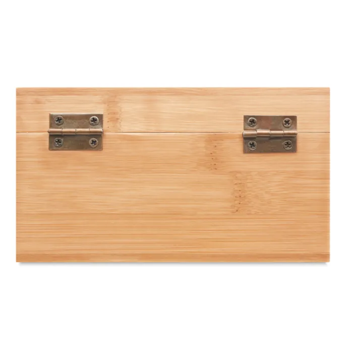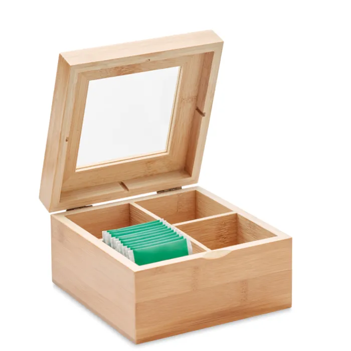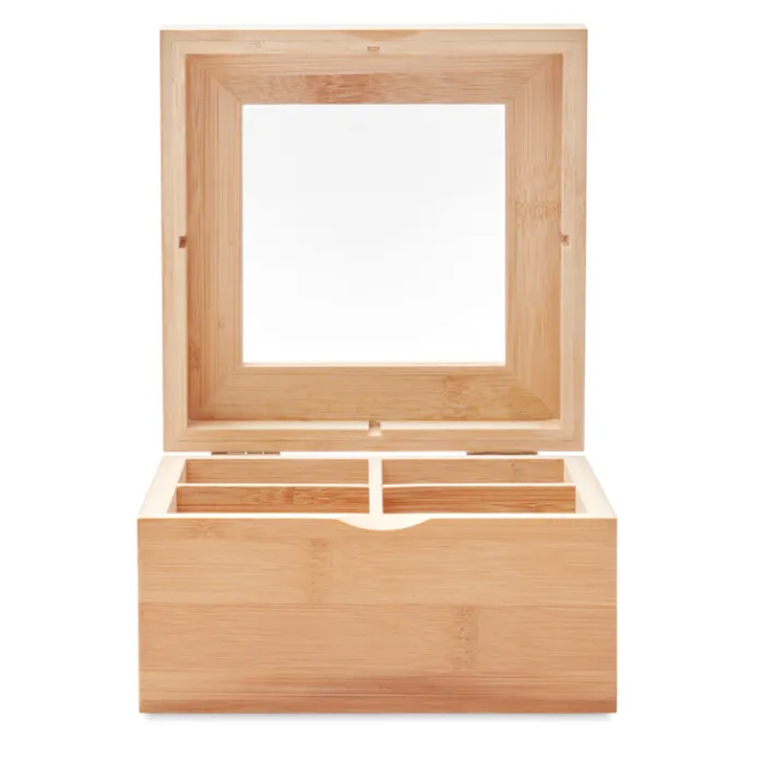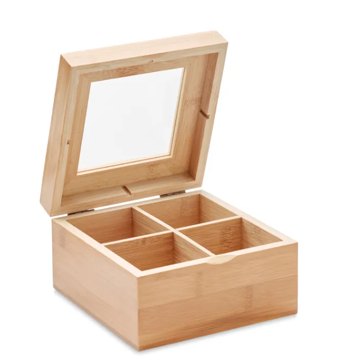 Scatola da tè in bambù con coperchio in vetro trasparente. La scatola è divisa in 4 scomparti che possono contenere fino a 24 bustine di tè ciascuno. Il bambù è un prodotto naturale, potrebbero esserci lievi variazioni di colore e dimensioni da un articolo all’altro.