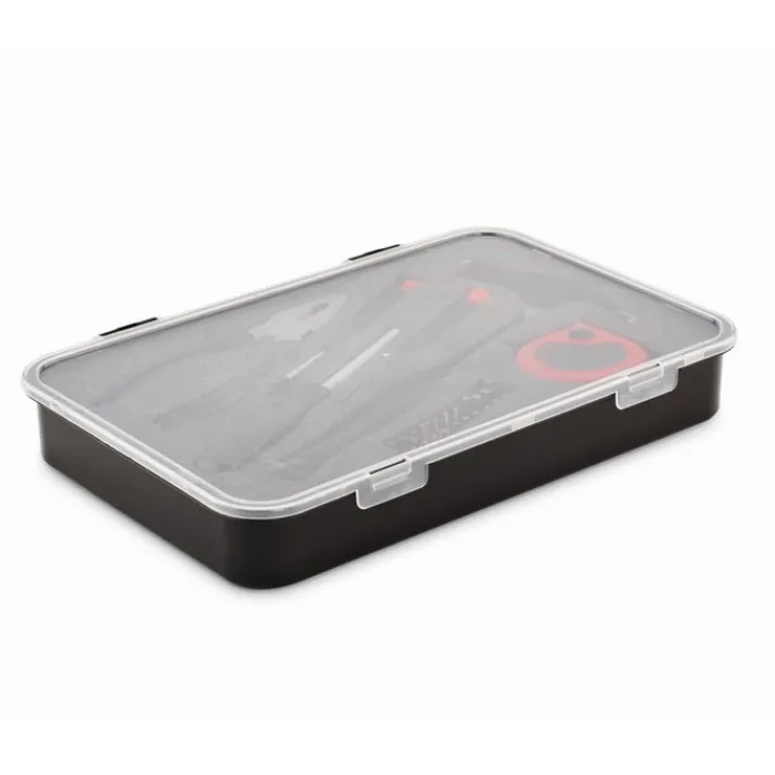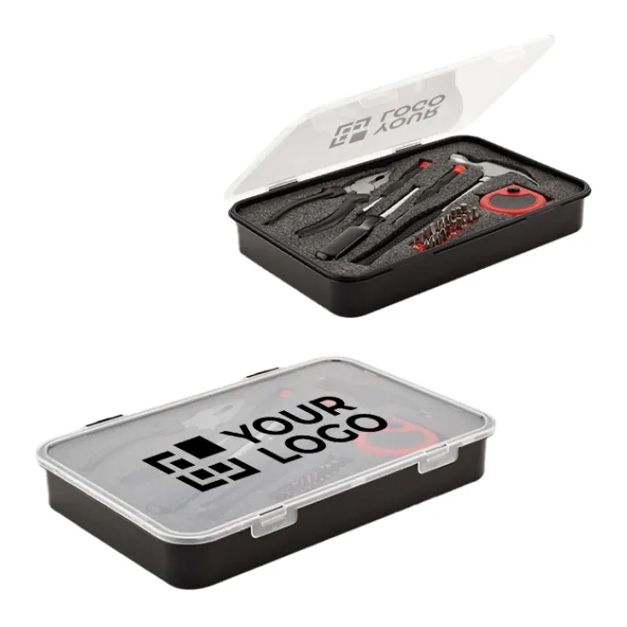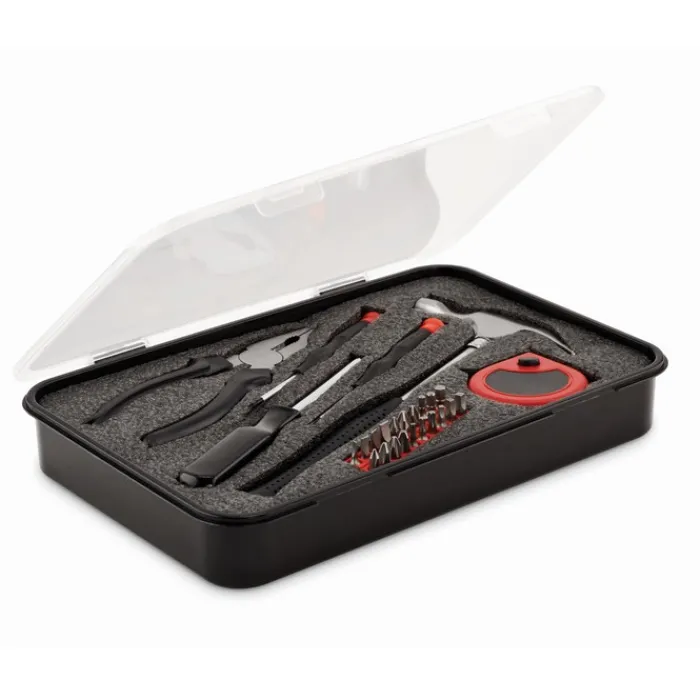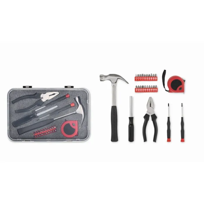 Set di attrezzi da 25 pezzi contenuti in una scatola di PP. Include un martello, un metro, una pinza combinate, 20 punte, un portapunte e 2 cacciaviti di precisione.