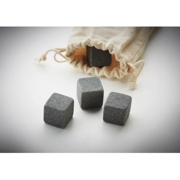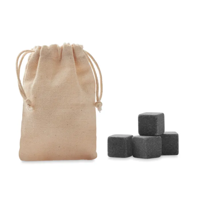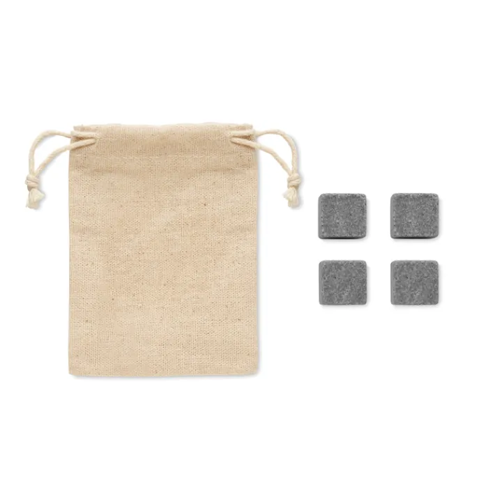 Set composta da 4 cubetti di ghiaccio in pietra riutilizzabili presentati in un sacchetto di cotone personalizzabile