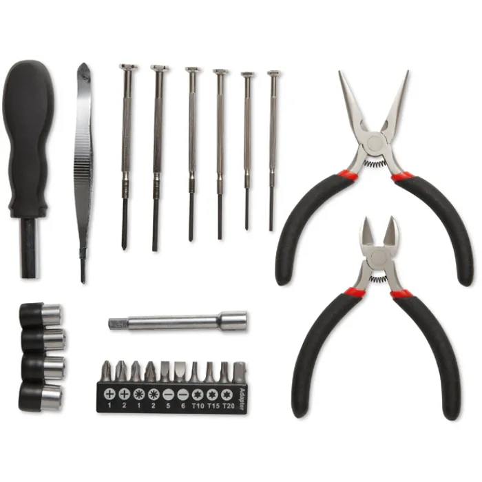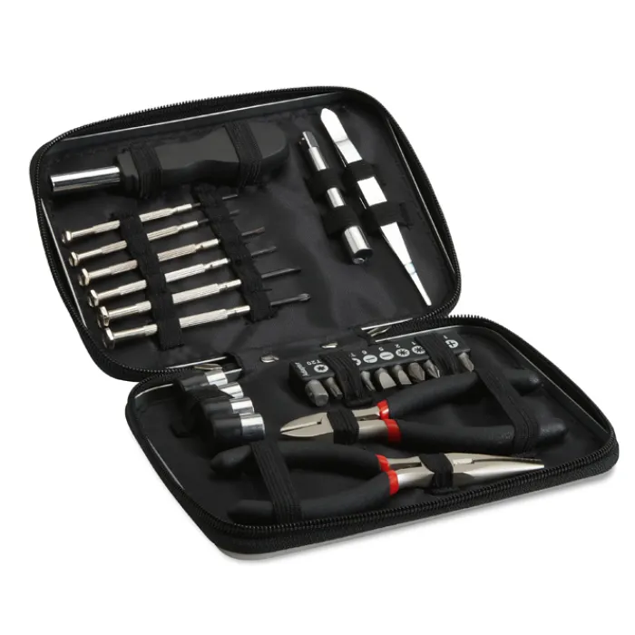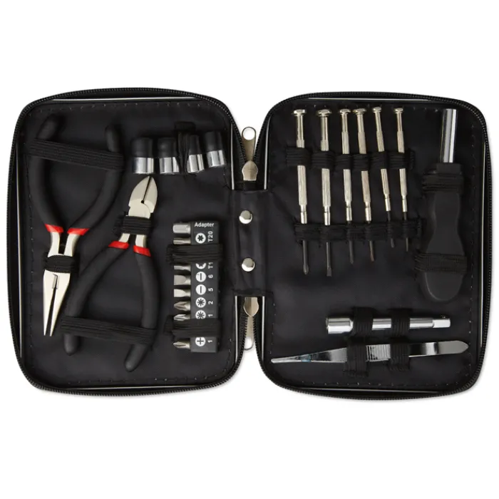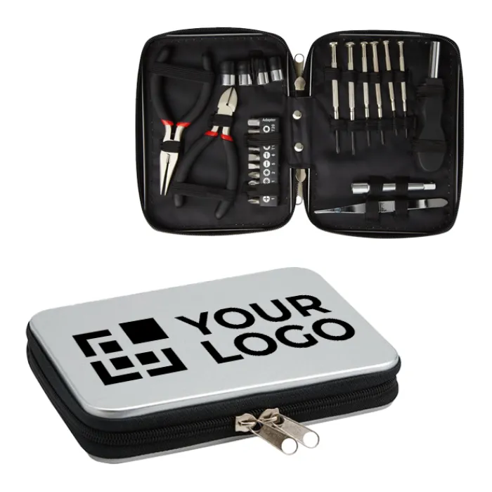 Set attrezzi in confezione di alluminio. Contiene: 1 tronchesina, 2 pinze, 6 cacciaviti di precisione, 1 cacciavite con meccanismo allungabile e 10 punte di ricambio.