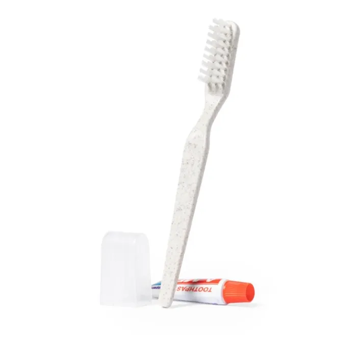 Set da viaggio che comprende uno spazzolino da denti in fibra di grano ed un dentifricio in un tubetto da 6 g con tappo a vite. Presentato in una scatola singola dal design kraft.