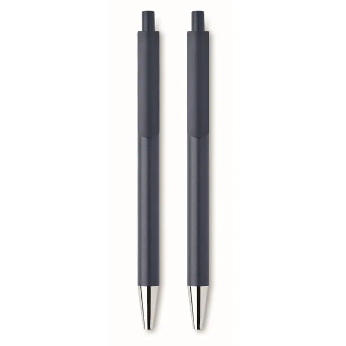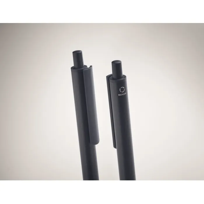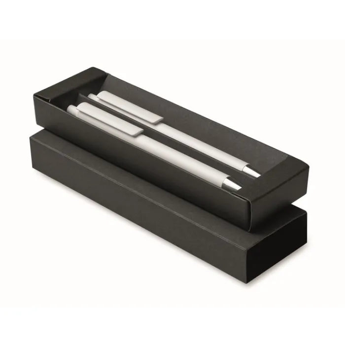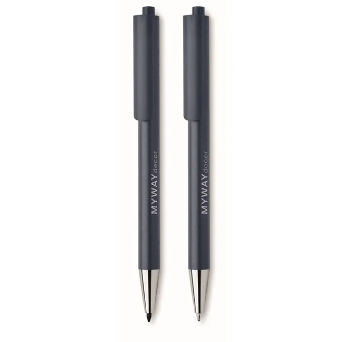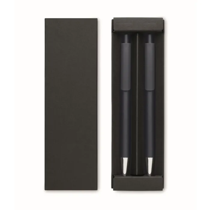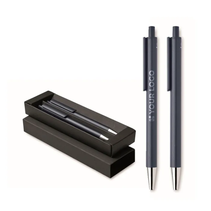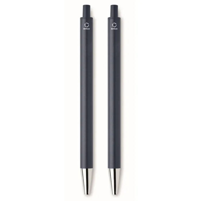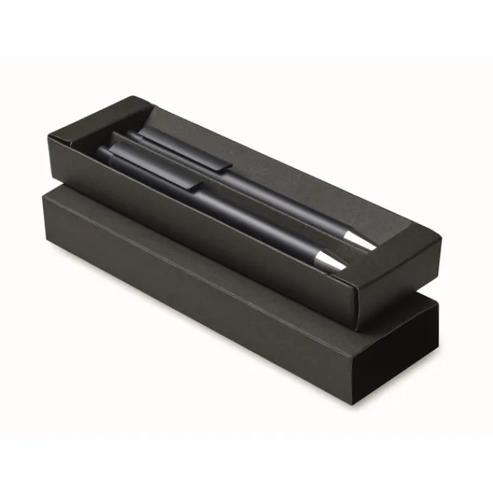 Set con 2 penne in alluminio riciclato: 1 penna a sfera con inchiostro blu e 1 penna in grafite senza inchiostro. Presentato in una scatola di carta riciclata.