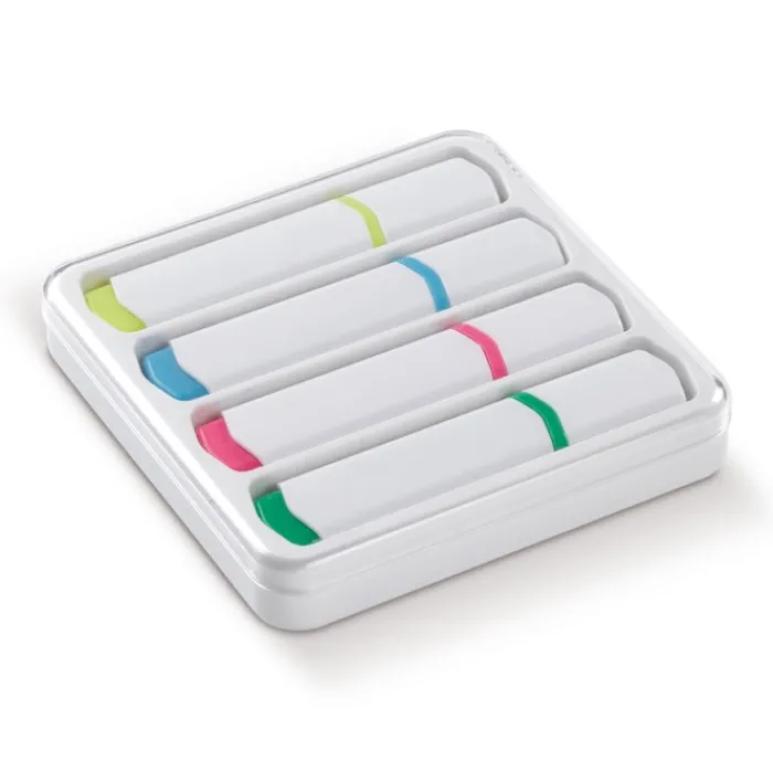 Set con 4 evidenziatori (giallo, blu, rosa e verde) racchiusi in una comoda scatola di plastica con coperchio trasparente. I dettagli colorati degli evidenziatori indicano il colore di scrittura. Durata di conservazione di almeno 6 mesi.