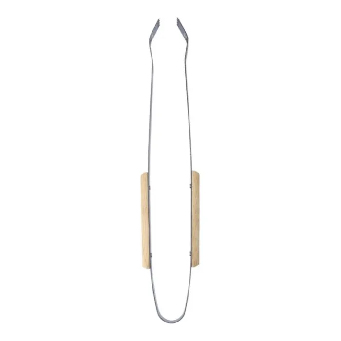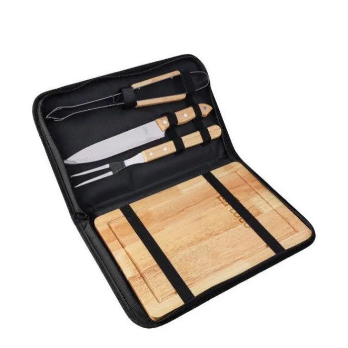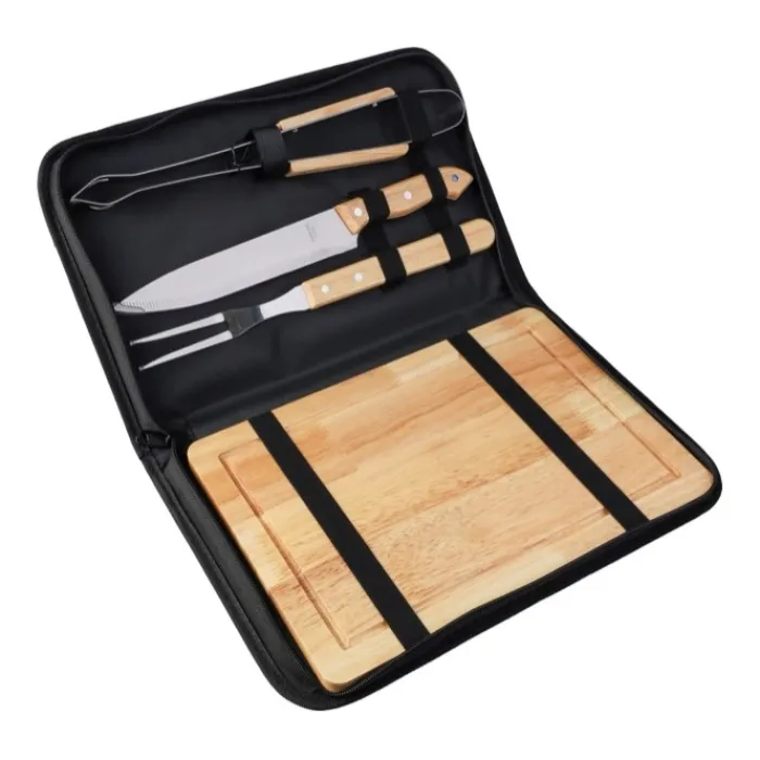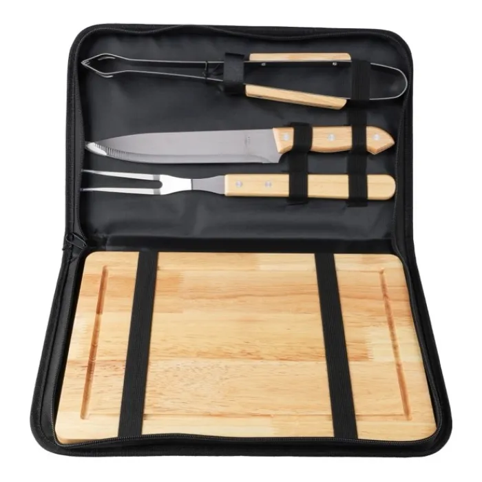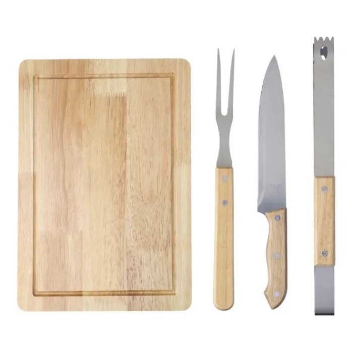 Set per il barbecue in acciaio inox con manici in legno. Include coltello, forchetta, pinze e tagliere in legno. Confezionato in scatola rigida in carta Kraft.