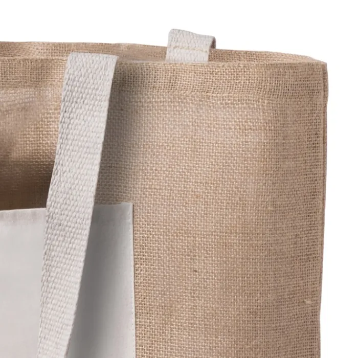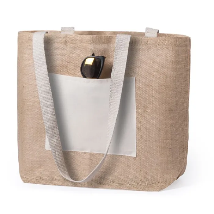 Shopper in iuta con tasca frontale e manici lunghi in cotone di colore bianco e soffietto da 15 cm. Può sostenere fino a 10kg di peso.