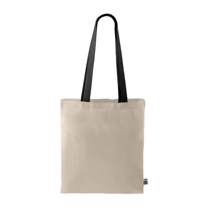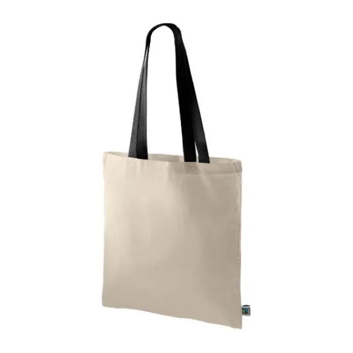 Shopper dai manici lunghi neri realizzata con cotone Fairtrade da 140 gr/m². Supporta fino a 5 kg di peso.
