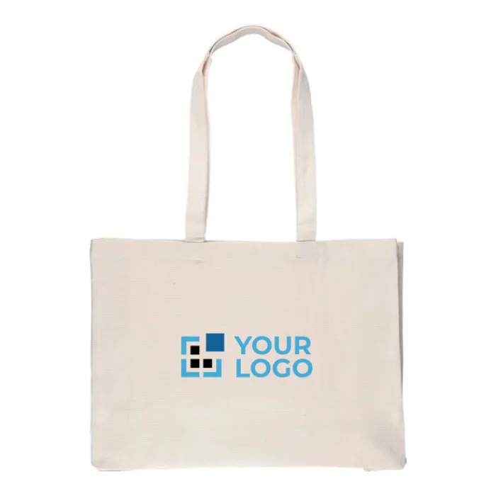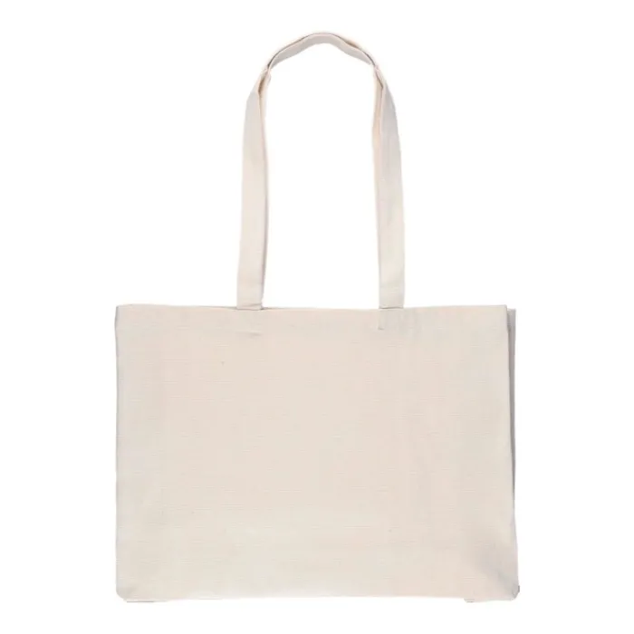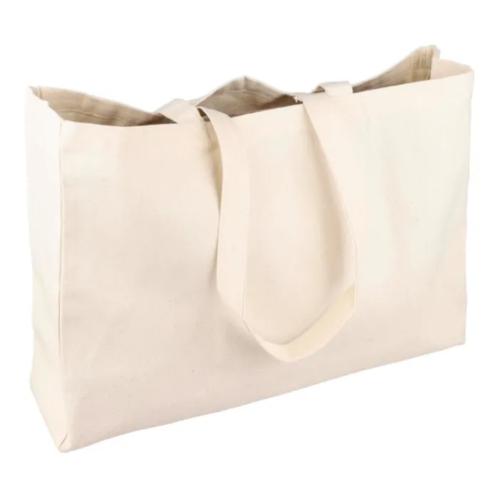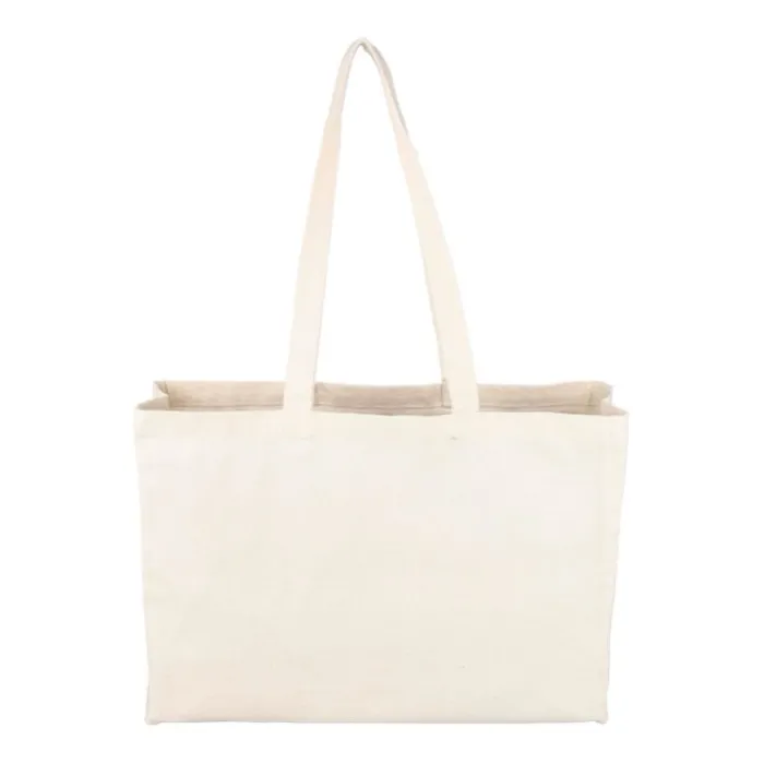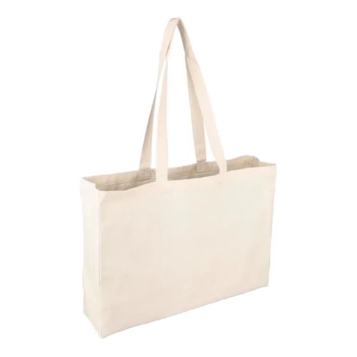 Shopping bag in cotone naturale Oeko-Tex® (280 g/m2) con soffietto da 10 cm. Peso massimo: circa 8 kg. Include etichetta Oeko-Tex®.