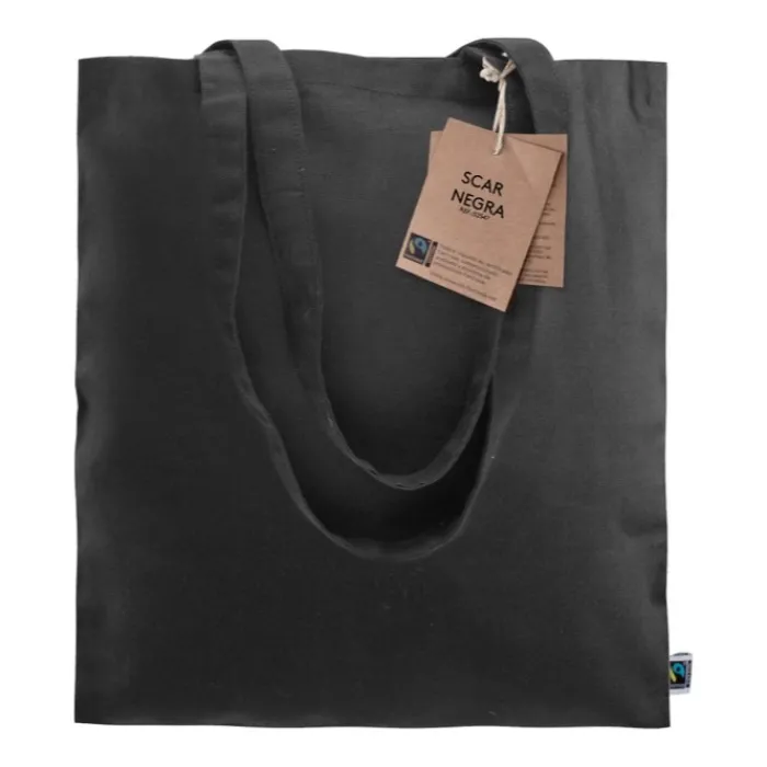 Borsa di colore nero, realizzata in cotone da 180 gr/m² con manici lunghi 70 cm. Supporta fino a 10 kg di peso. Articolo proveniente dal commercio equo e solidale.