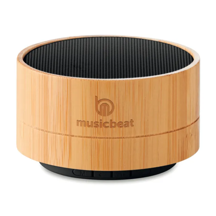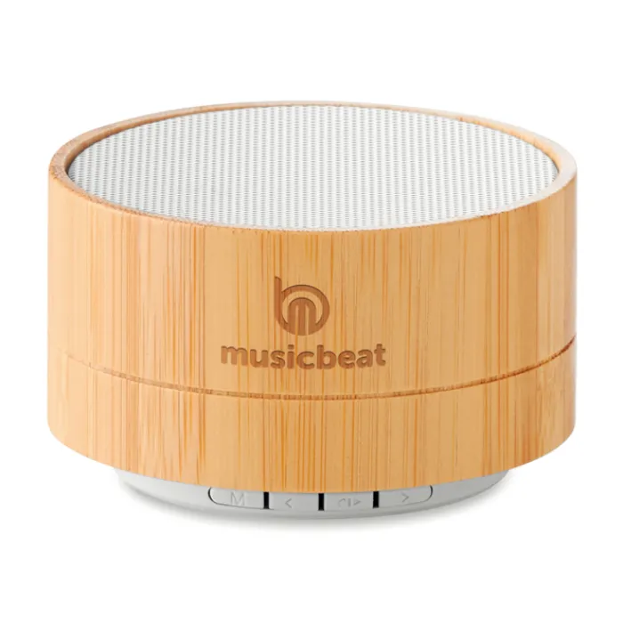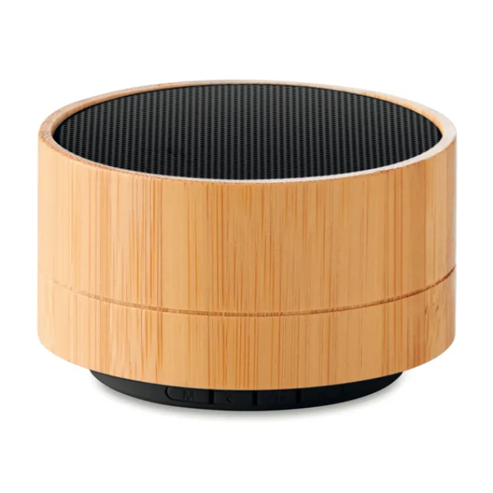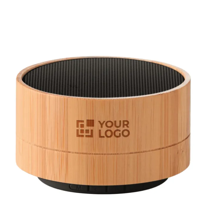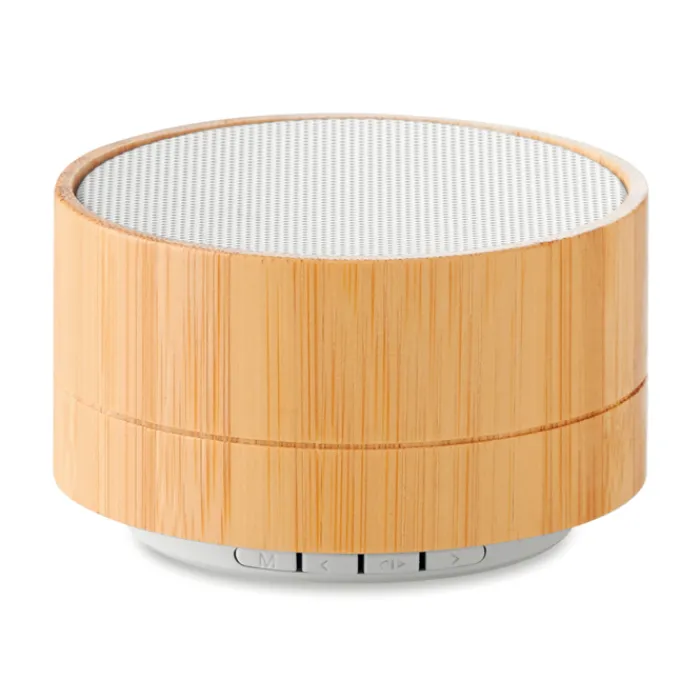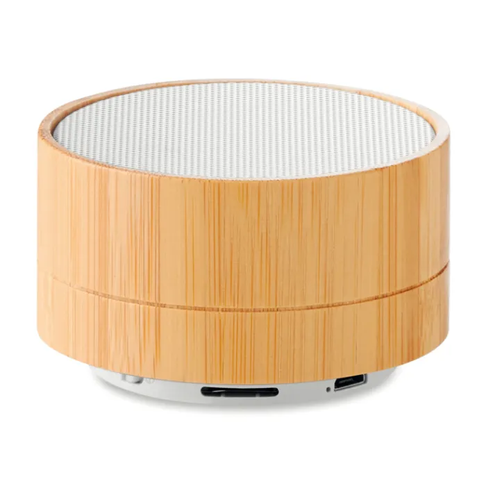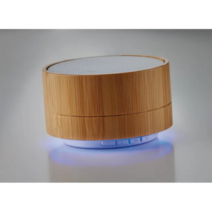 Speaker Bluetooth 4.2 in ABS rivestito in bambù. 1 batteria ricaricabile Li-on 450 mAh e luce nella parte inferiore dello speaker. Output: 3W, 4 Ohm e 5V. Cavo micro USB incluso.