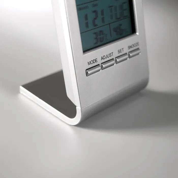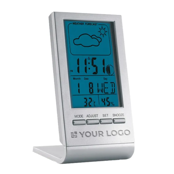 Aggiungi il tuo logo a questa stazione meteorologica e scegli un regalo promozionale classico ed efficace. Grazie al suo schermo LCD blu, permette di visualizzare a colpo d’occhio previsioni del tempo, ora, data, temperatura e umidità. Include una sveglia per aiutarti a essere sempre puntuale e si gestisce facilmente tramite quattro pulsanti integrati. Funziona con una batteria a bottone inclusa, pronta all’uso fin da subito. Realizzata in plastica, il suo design compatto e moderno da scrivania si adatta perfettamente a qualsiasi ambiente, sia in ufficio che a casa, aggiungendo un tocco di sofisticazione. Disponibile con servizio Express per consegne rapide.