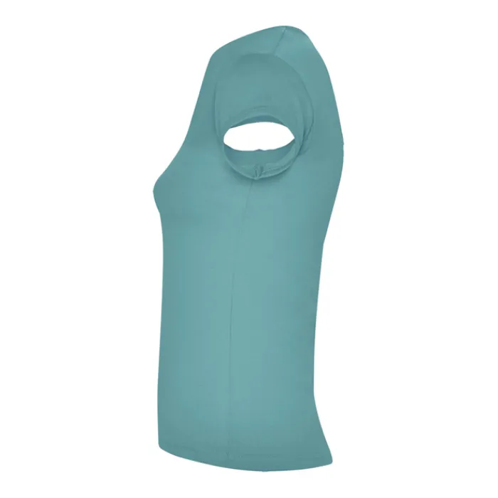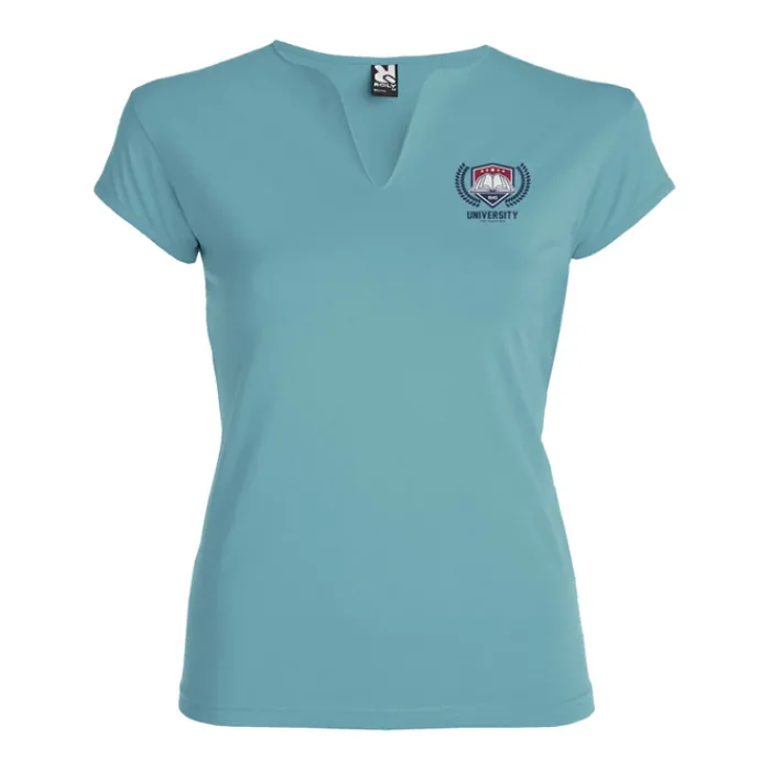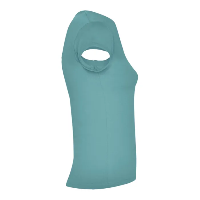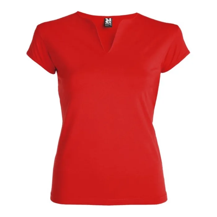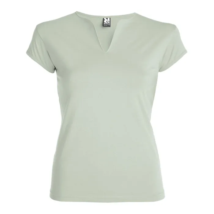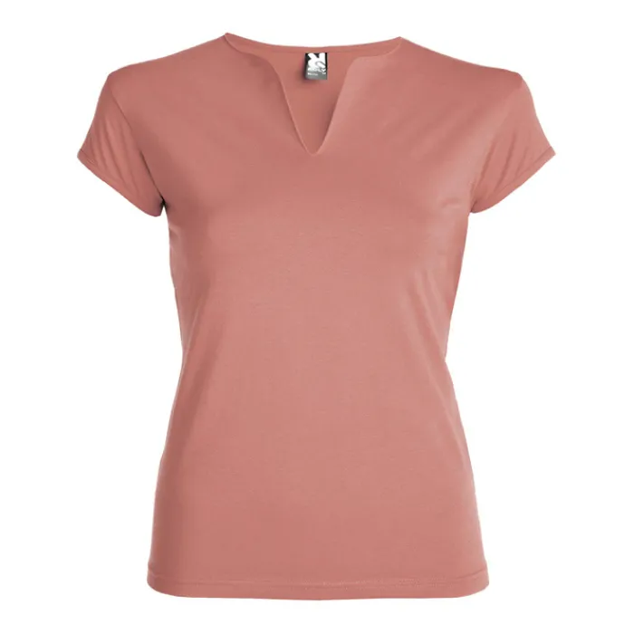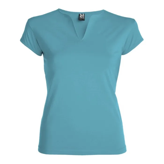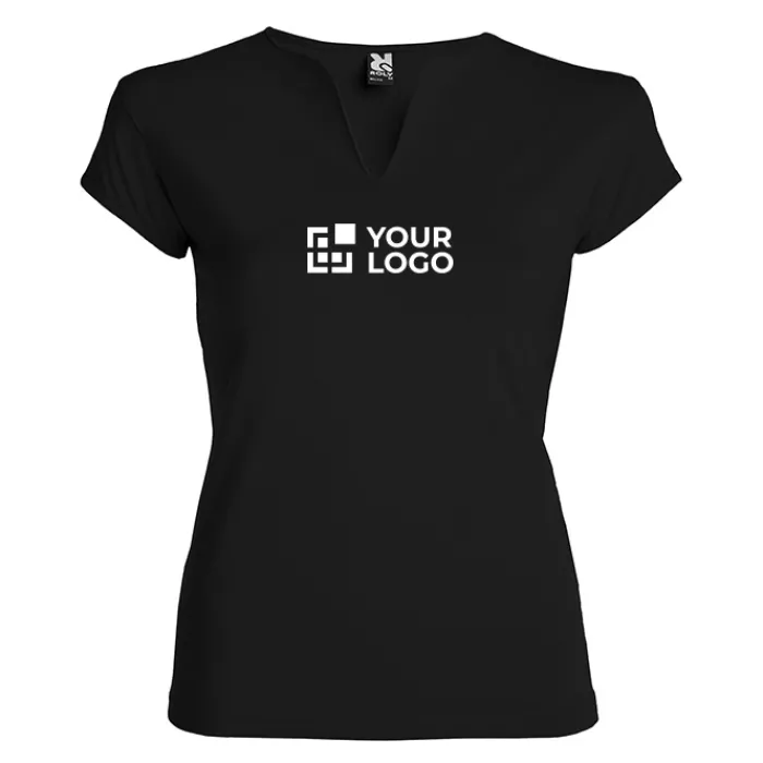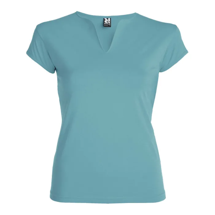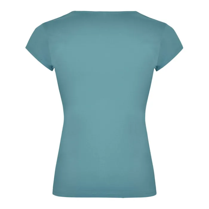 T-shirt aderente con scollo a V, a mezze maniche con bordo e cuciture laterali. Tessuto di elevata qualità con una sensazione morbida e piacevole al tatto. Etichetta rimovibile. Single Jersey 94% Cotone e 6% Elastan, 200 g/m². La modella della foto è alta 179 cm ed indossa una taglia S.