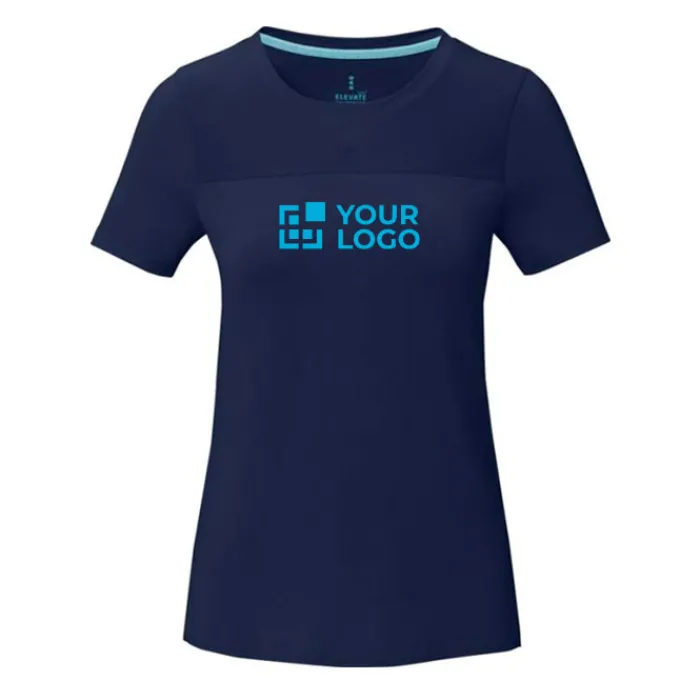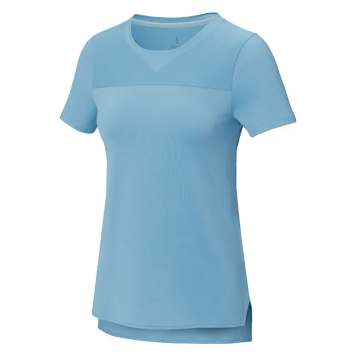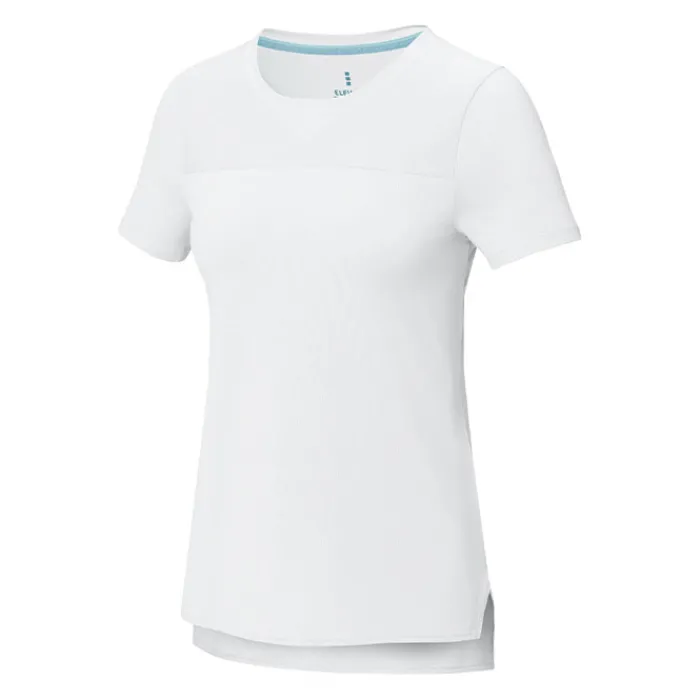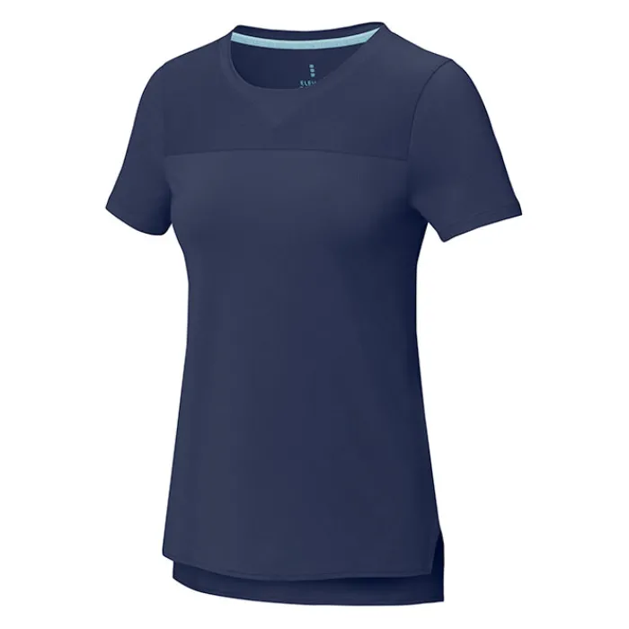 T-shirt a maniche corte da donna con finiture cool fit da 160 g/m², realizzata al 90% in poliestere riciclato certificato GRS e 10% in elastan. Girocollo con dettaglio a V. Colletto dello stesso tessuto. Spacchetti laterali. Fettuccia da spalla a spalla con logo bicolore. Etichetta principale stampata in transfer per maggiore comfort. Questo articolo è stato sviluppato in collaborazione con Waste2Wear.