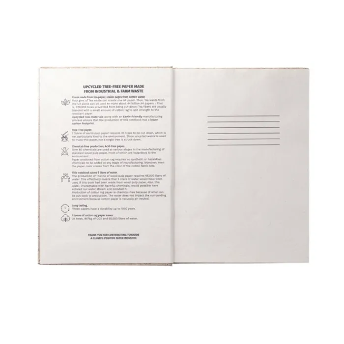 Taccuino formato A5 con copertina rigida realizzata con i residui delle foglie del tè. Contiene 120 resistenti pagine a righe realizzate con gli scarti del cotone. Consegnato con una fascia di carta con l’immagine di foglie di tè.