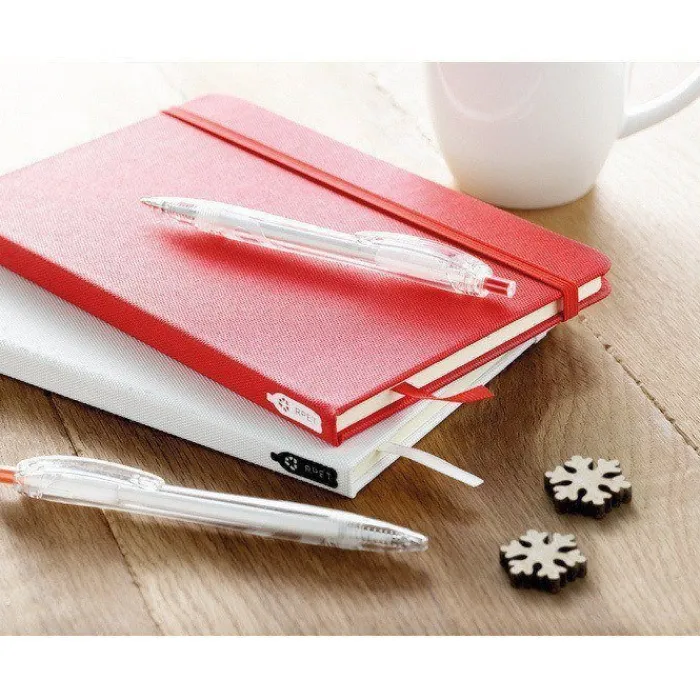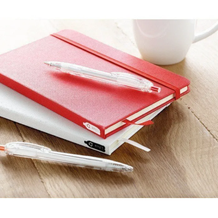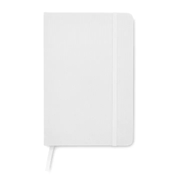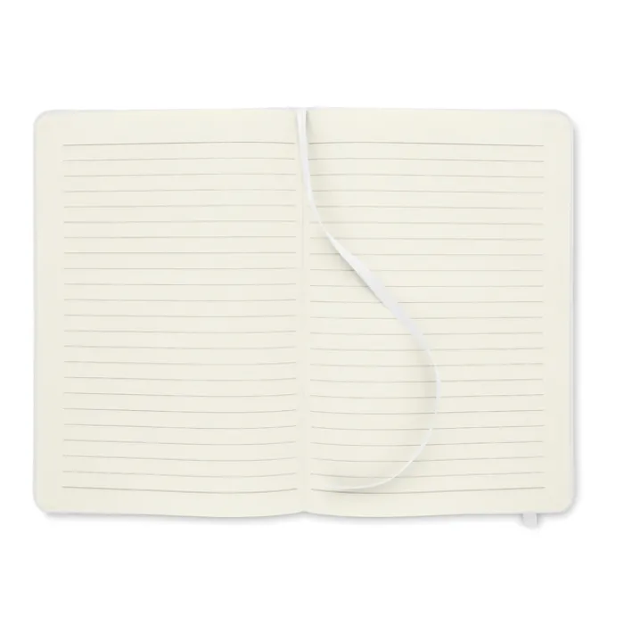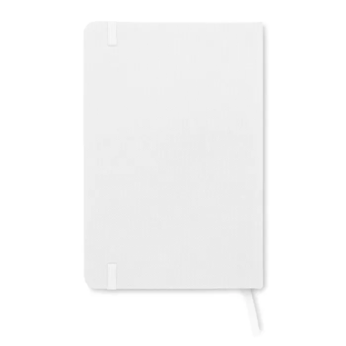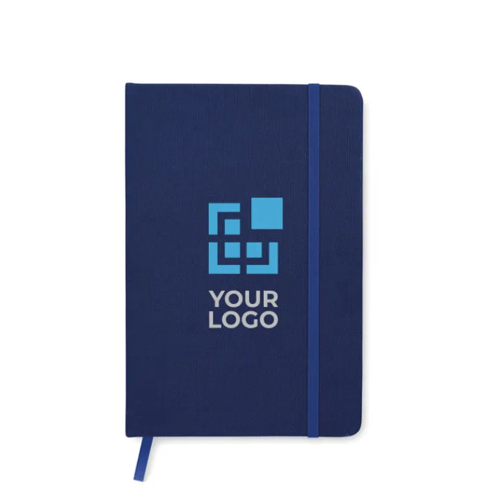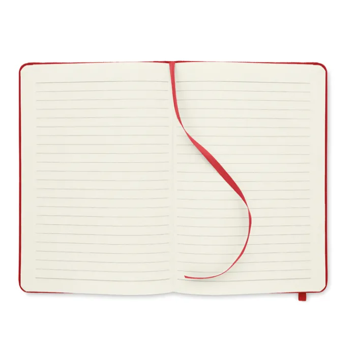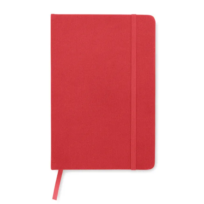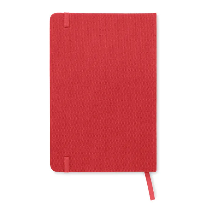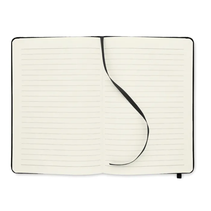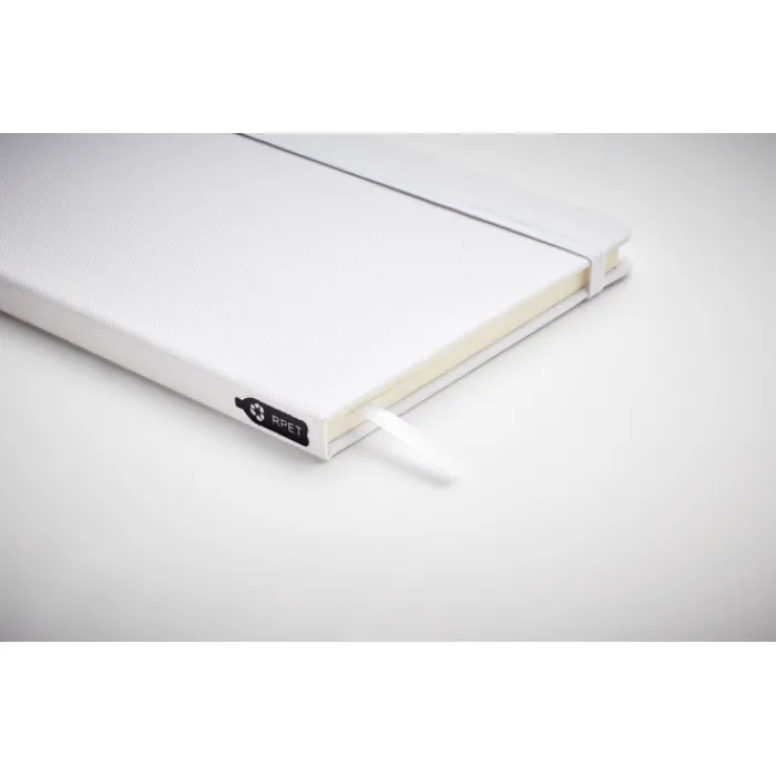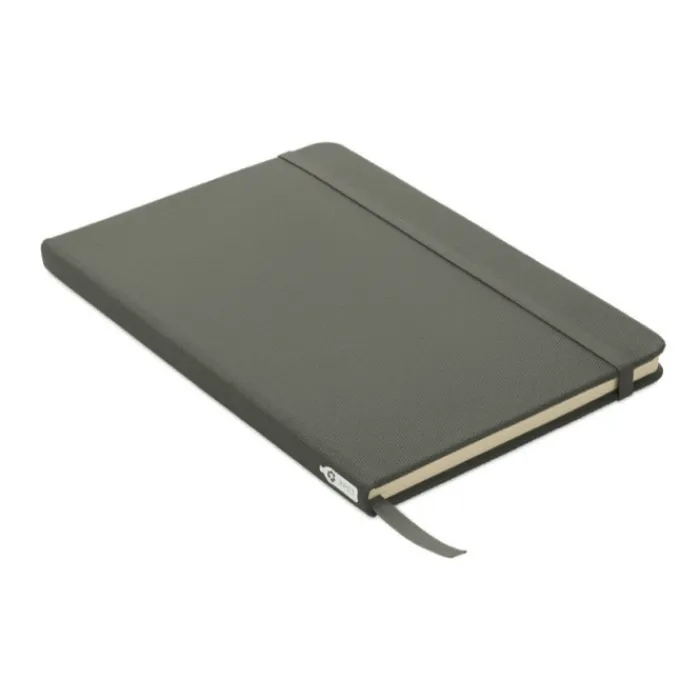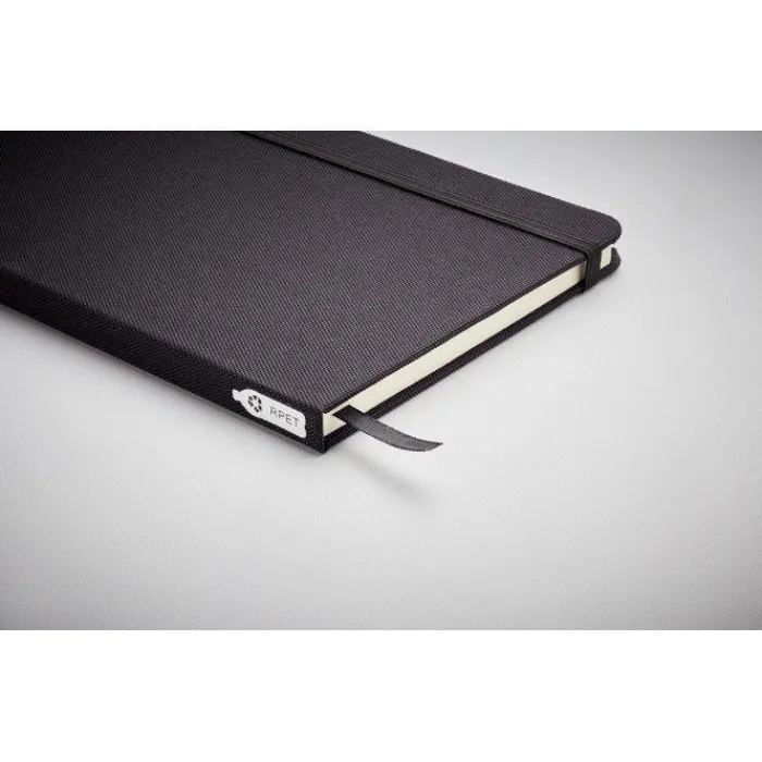 Taccuino A5 con copertina in RPET da 600D contenente 80 pagine a righe in carta riciclata, con segnapagina ed elastico.