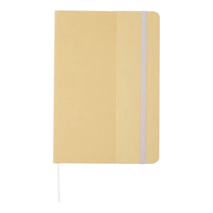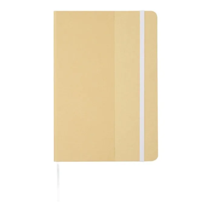 Taccuino formato A5 con copertina rigida in cartone riciclato certificato FSC Mix. Contiene 80 fogli a righe di carta da 70 g/m². Ha una chiusura con elastico, un nastrino segnapagina e angoli arrotondati.