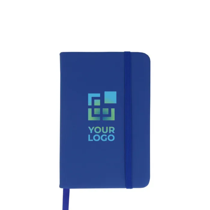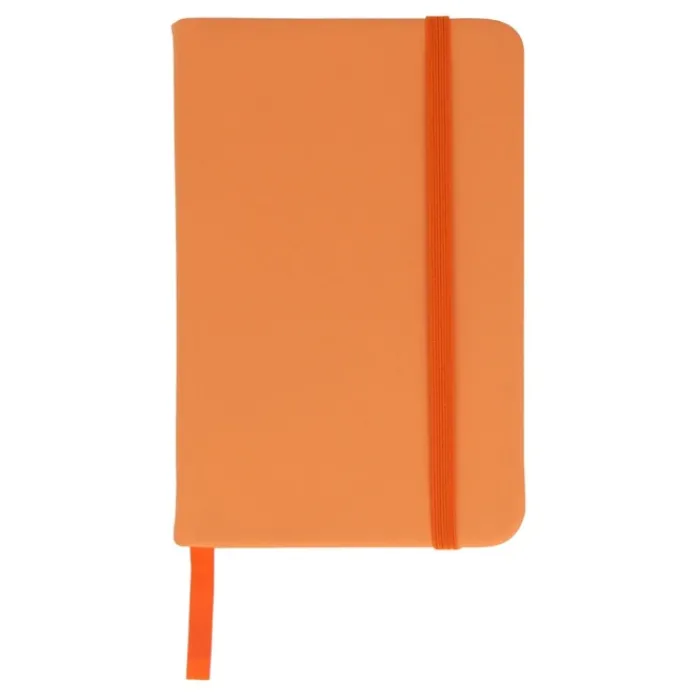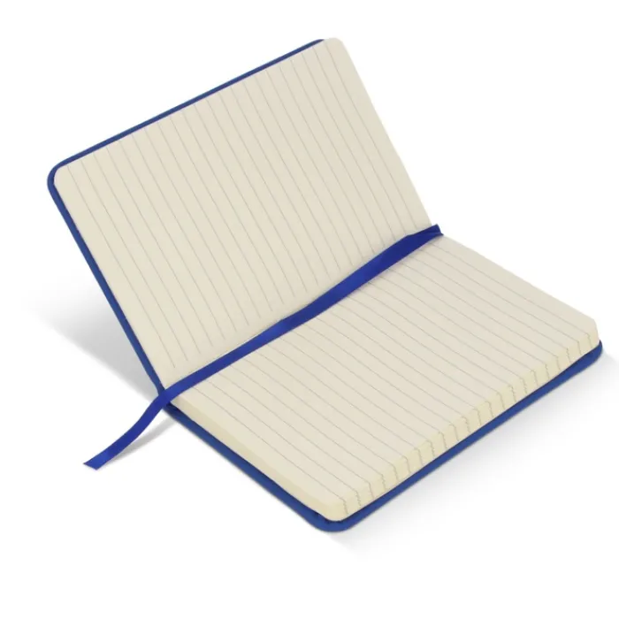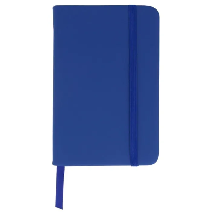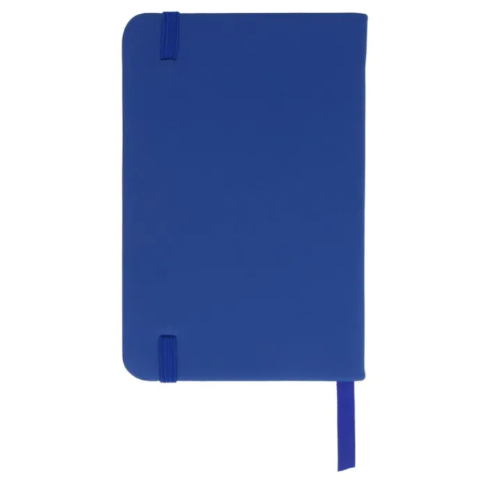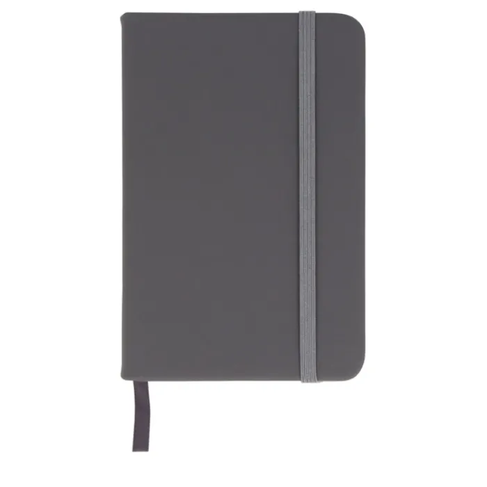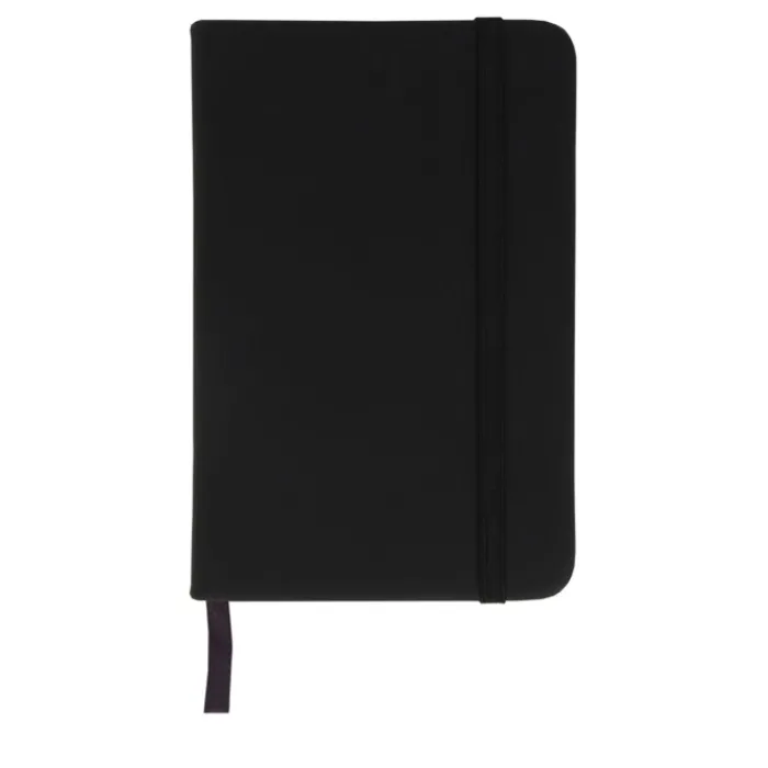 Taccuino formato A6 con copertina in r-PET e PU certificato GRS con elastico di chiusura e nastrino segnapagina. Contiene 80 fogli (160 pagine) foderate di carta FSC da 70g/m² a righe.