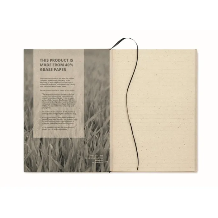 Taccuino A5 con 80 fogli (160 pagine) a righe di carta erba e copertina in cartone. La carta erba è un materiale alternativo in fibra vegetale derivato dall’erba. Dall’inizio alla fine, il processo di produzione è sostenibile e più rispettoso dell’ambiente rispetto alla tradizionale carta a base di legno. Prodotto in UE.
