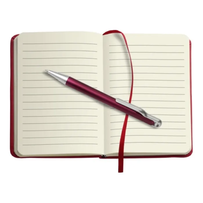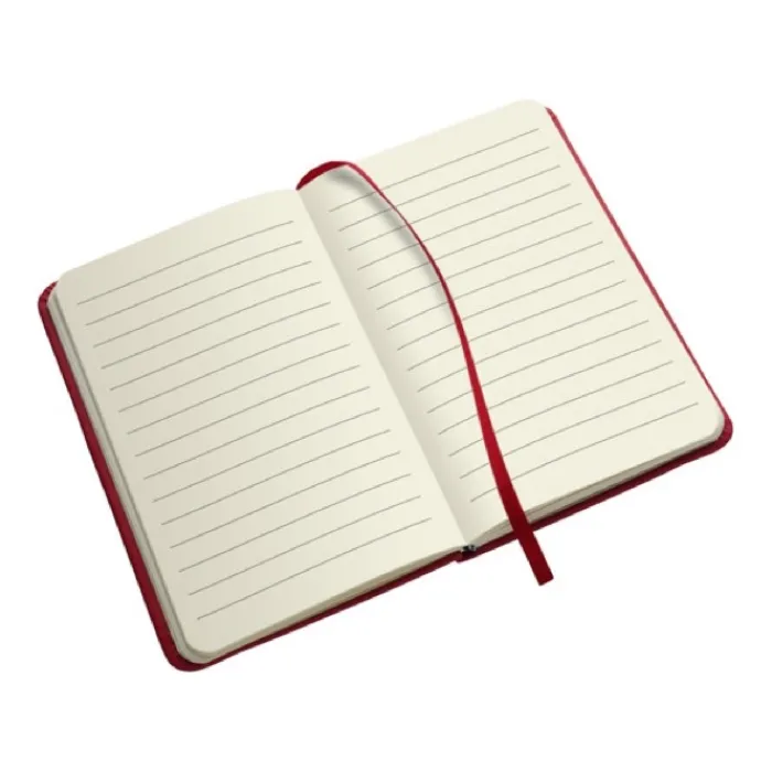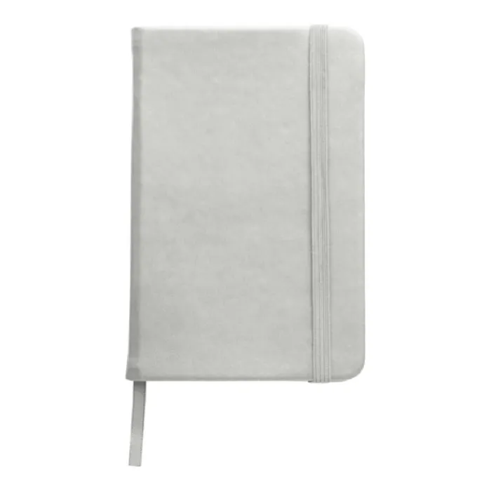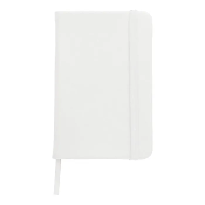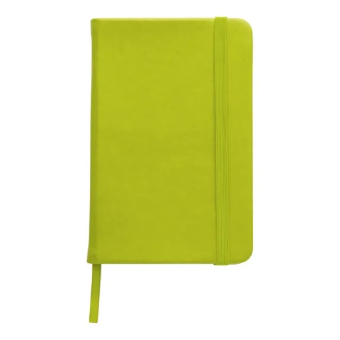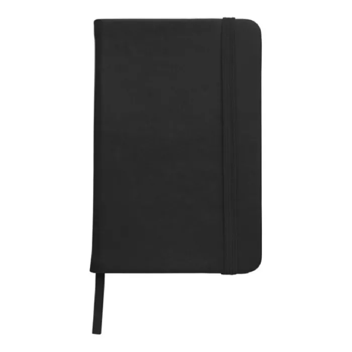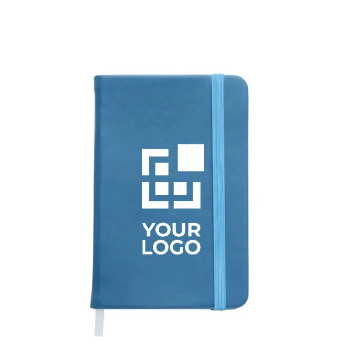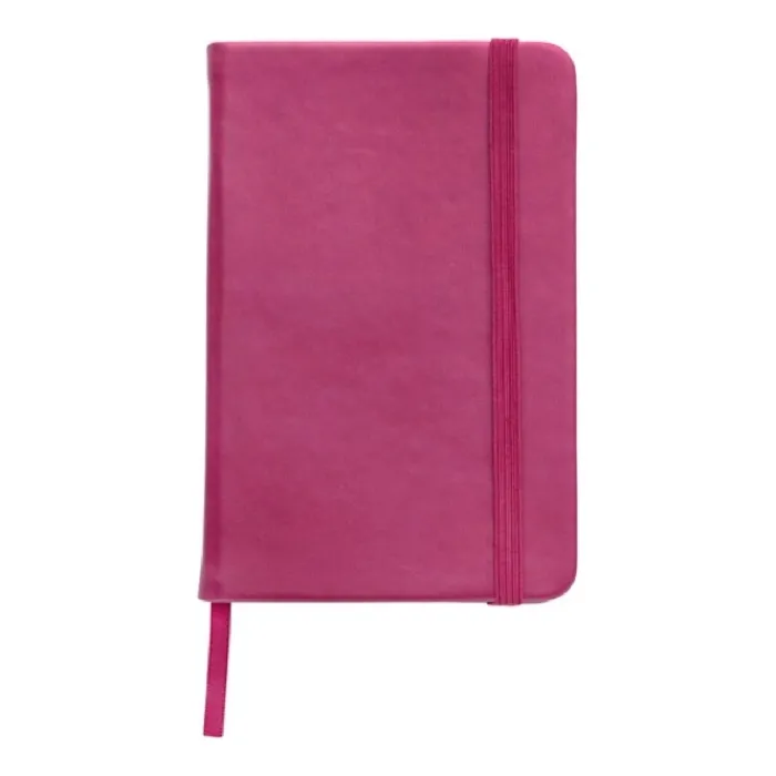 Taccuino formato A6 con copertina colorata in PU. Elastico di chiusura e segnapagina in tinta.