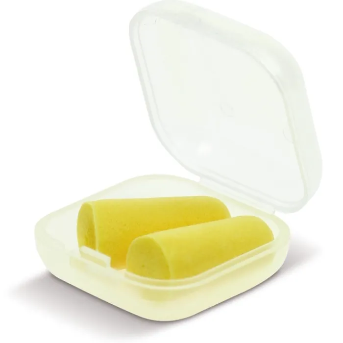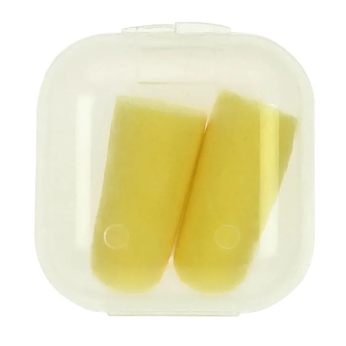 Tappi per le orecchie gialli in scatoletta di plastica trasparente.