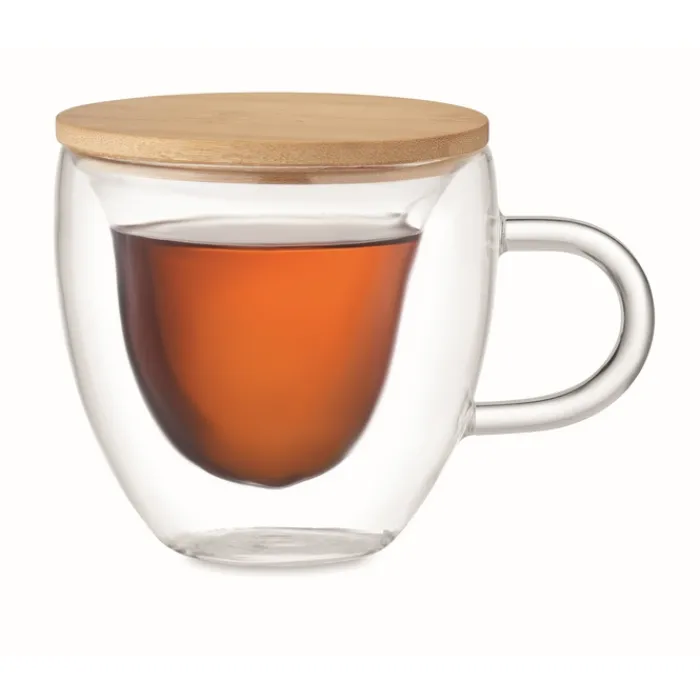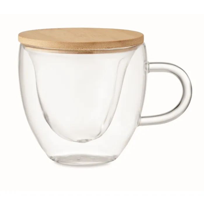 Tazza in vetro borosilicato a doppia parete con tappo in bambù. Capacità: 180 ml. Il bambù è un materiale naturale, per cui potrebbero esserci leggere variazioni di colore in ogni tappo.