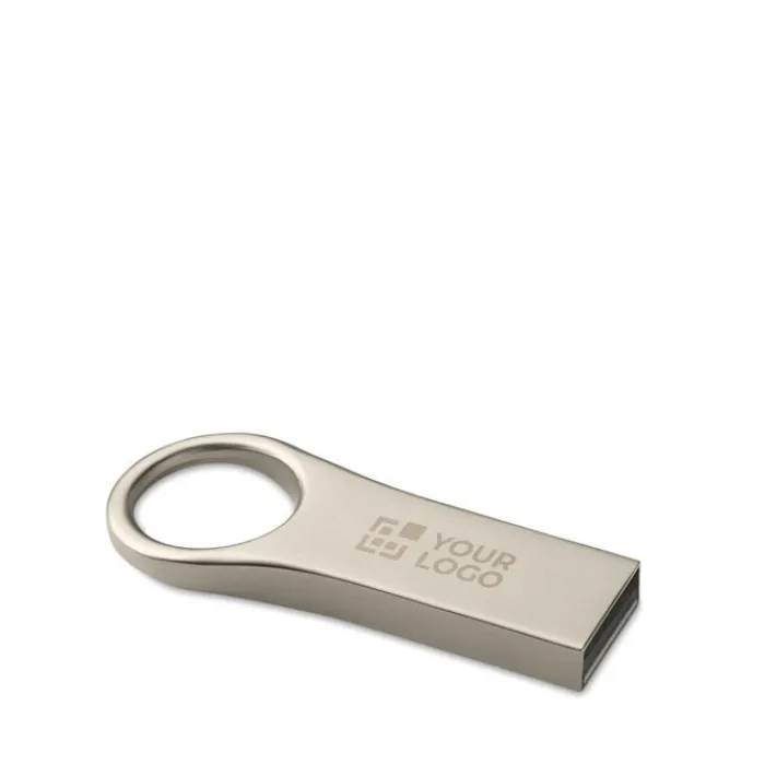 Memoria USB promozionale dal design compatto, con anello incorporato molto grande. Realizzata in alluminio la chiavetta USB può essere personalizzata anche con un’incisione laser oltre che con la stampa a colori (massimo 3 colori).