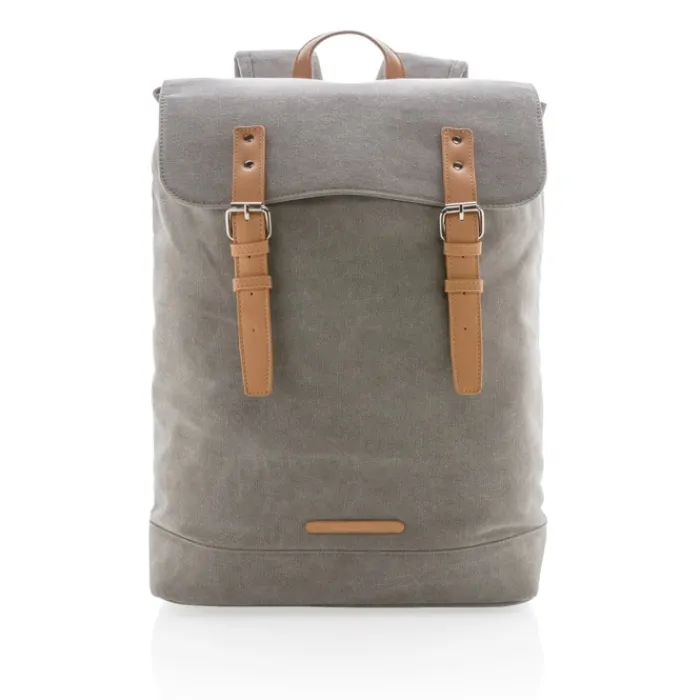Zaino in canvas resistente che include uno scomparto imbottito per computer portatile da 15”. La patella si richiude tramite 2 fibbie magnetiche in similpelle. Senza PVC.