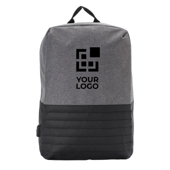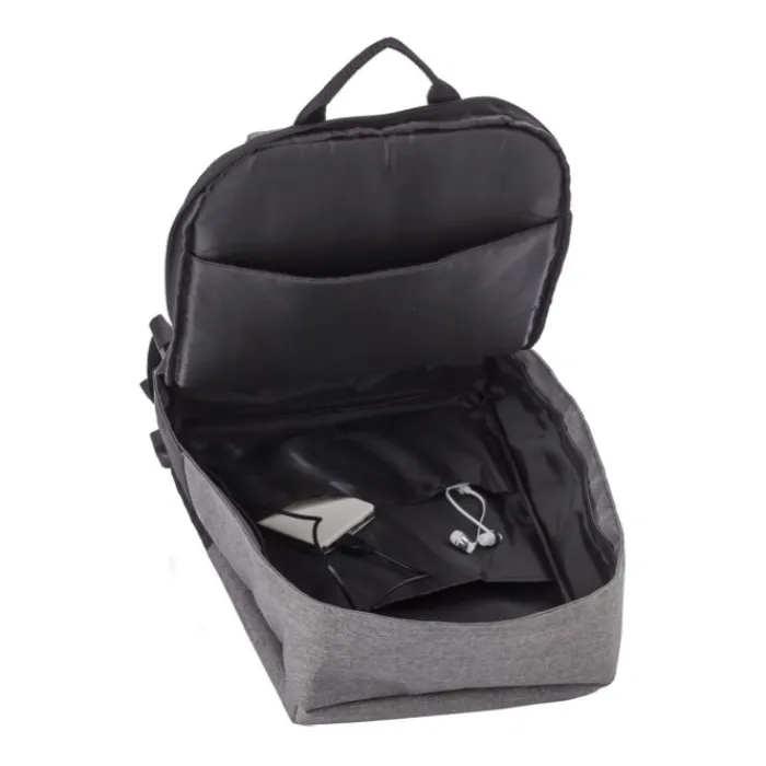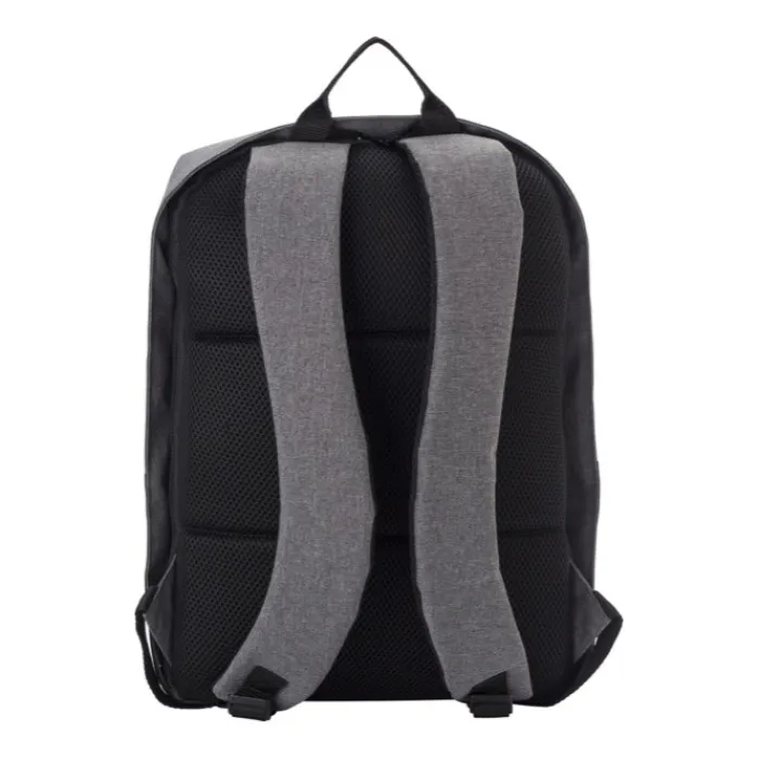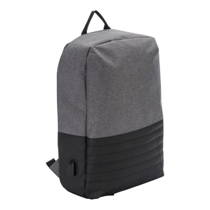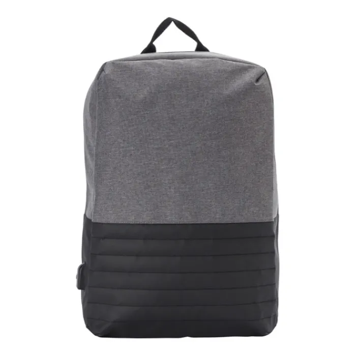 Zaino antitaccheggio bicolore realizzato in PVC da 600 D e 300 D, con schienale e spallacci imbottiti e regolabili. Dispone di un ampio scomparto principale con cerniera e spazio imbottito per pc portatile da 15”. Include una porta USB su un lato.
