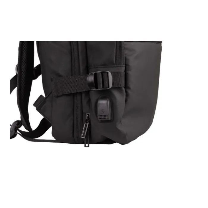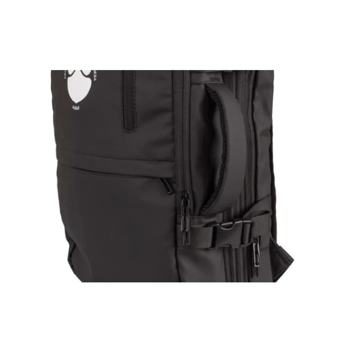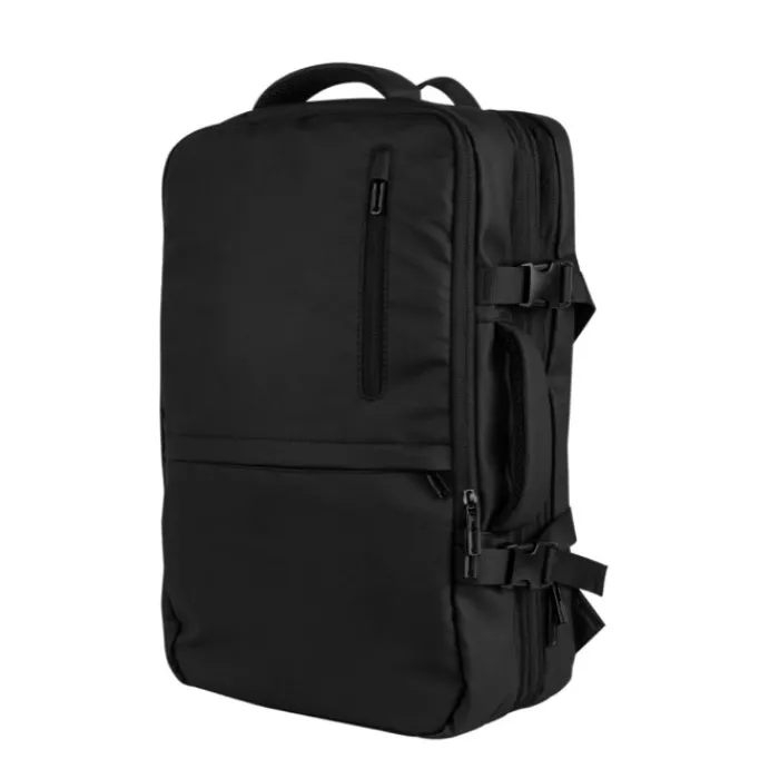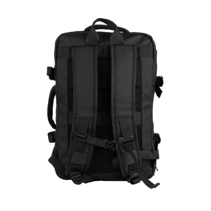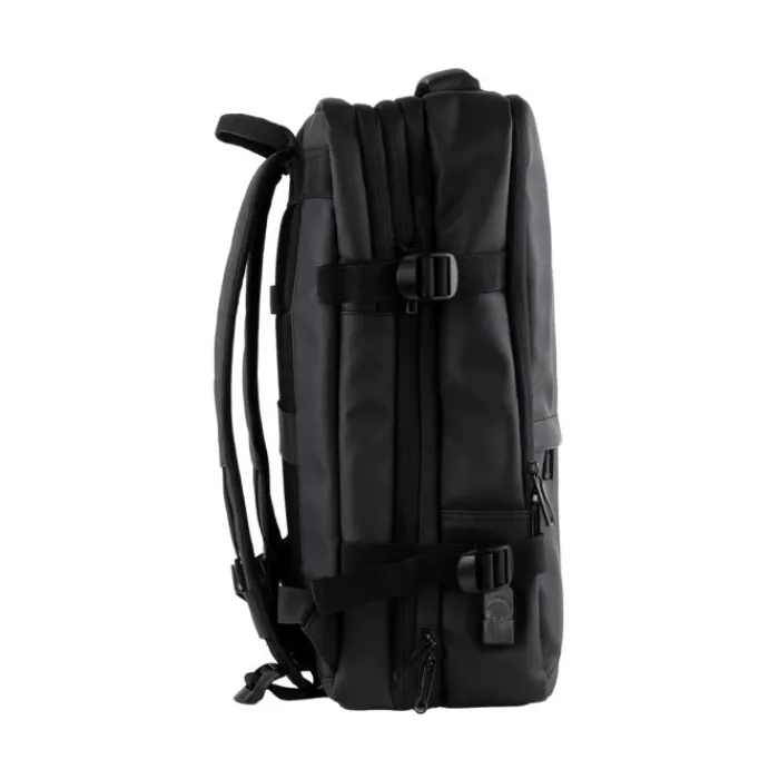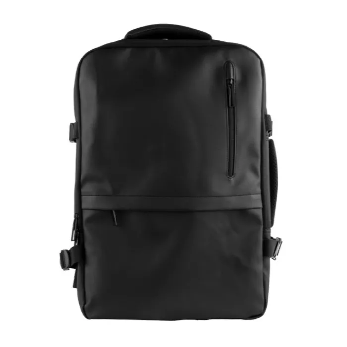 Zaino realizzato in PU 900D con finitura impermeabile e fibbie laterali. Dispone di imbottitura interna ed esterna, con varie tasche e scomparti di cui uno espandibile. Include una fascia per agganciarlo al trolley, una maniglia superiore e una laterale che ti permette utilizzarlo come una borsa. Spallacci regolabili. Può essere utilizzato come bagaglio a mano. PVC free.