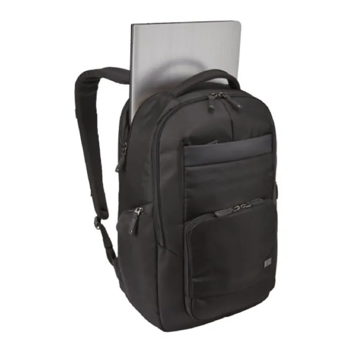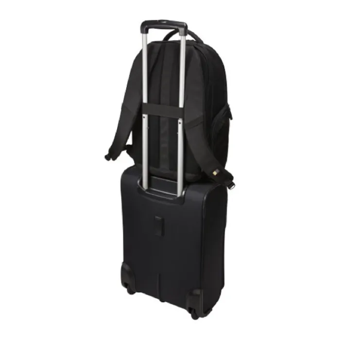 Zaino in nylon con ampio scomparto principale con doppia cerniera, al cui interno ci sono vari pannelli divisori, uno spazio imbottito per pc da 15,6” e tablet da 10,1” e una tasca interna a rete con cerniera per cavi e accessori. Doppia tasca frontale con spazio organizzato per penne, tessere e chiavi. Tasca laterale espandibile e dall’altro lato ha una porta usb. Maniglia e spallacci imbottiti, pannello posteriore in rete traspirante trapuntata e fascia per agganciarlo al trolley. Garanzia Case Logic: 25 anni.